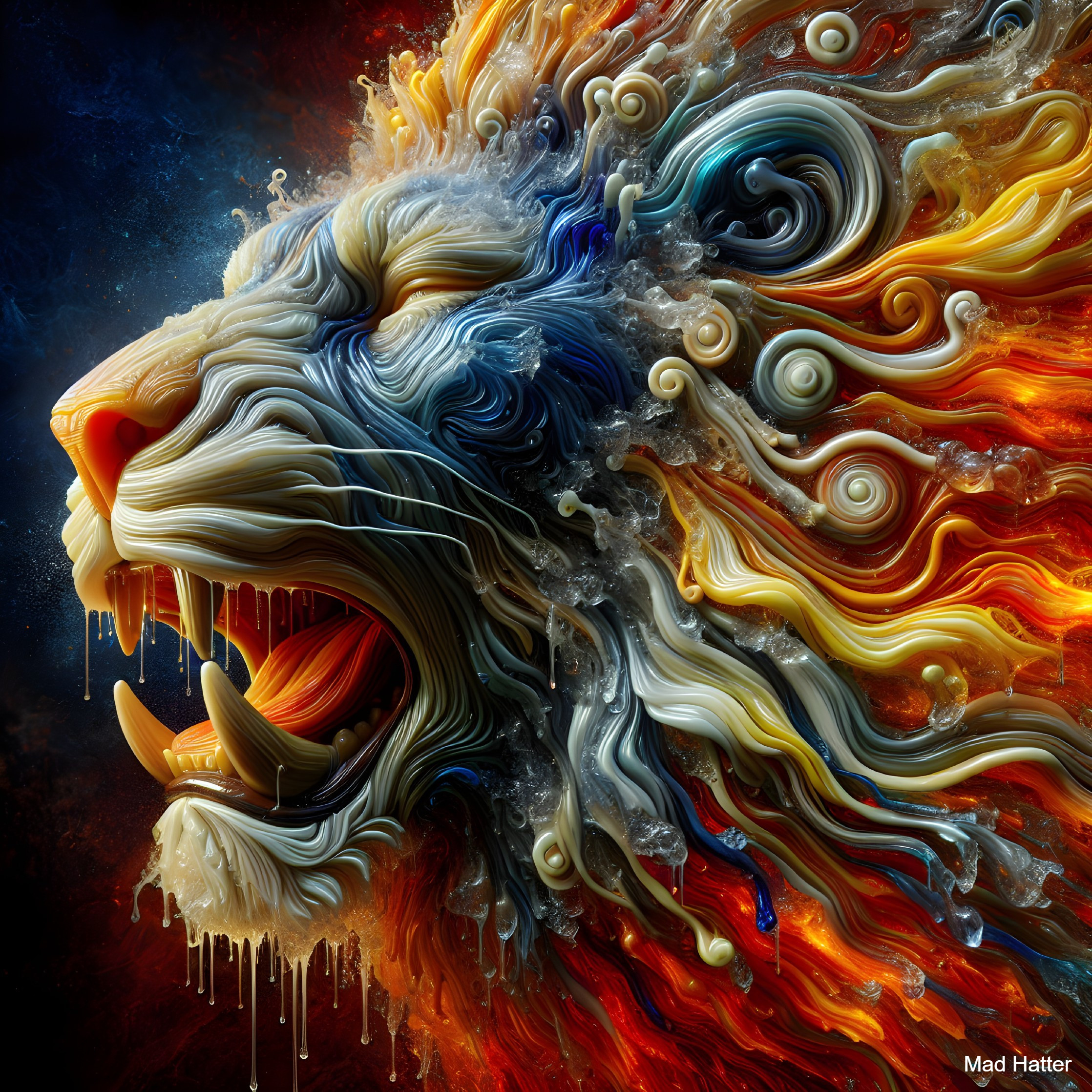 Surreal depiction of a lion roaring, with swirling colors and fluid textures that evoke liquid glass, creating a dynamic and expressive representation of the majestic creature.