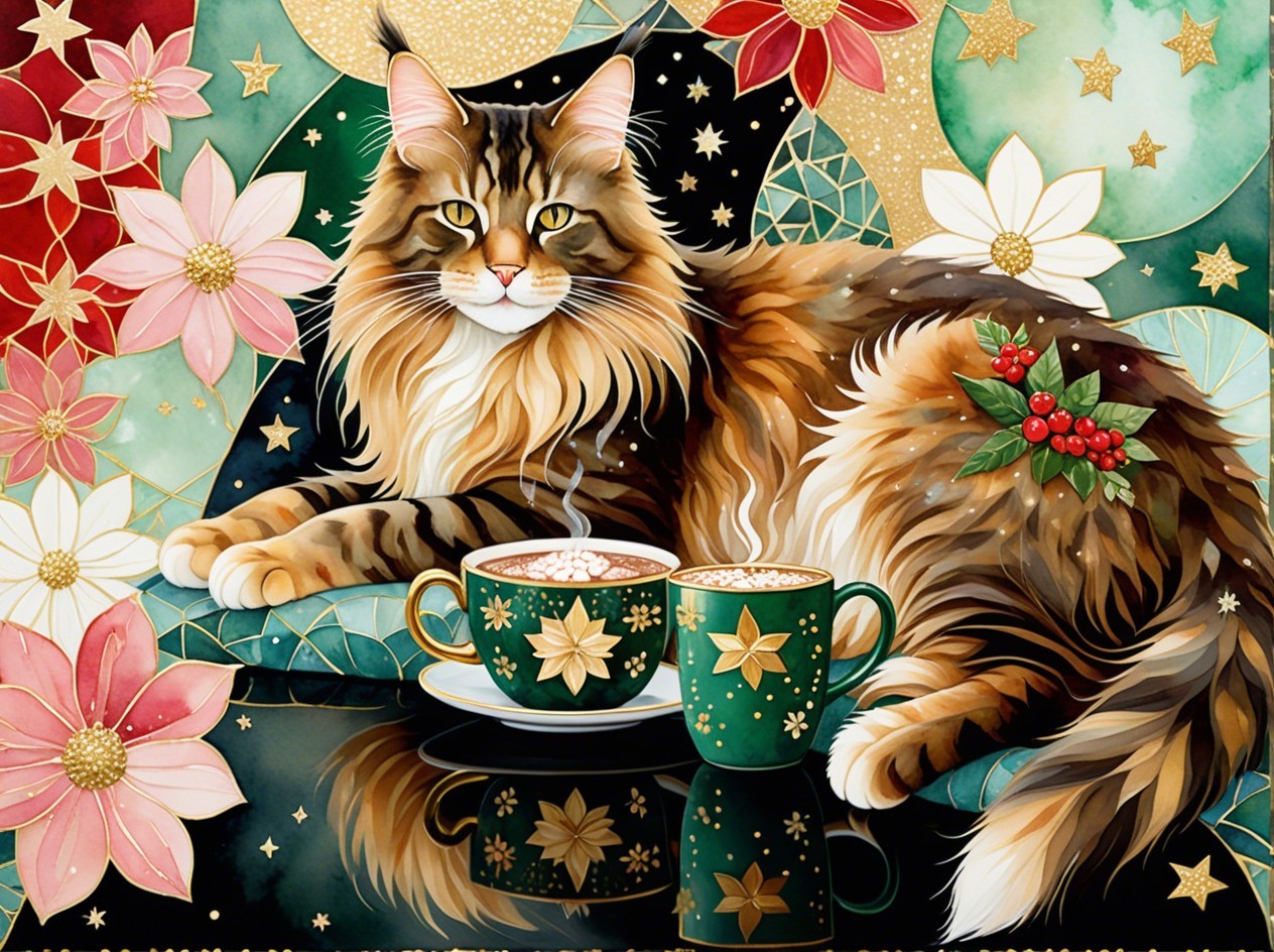 Prompt: Mystical atmosphere, a festive Maine Coon cat cozies up with hot chocolate, sparkling stars, intricate floral patterns, shimmering gold accents, mosaic patchwork background, soft watercolor textures, wet on wet technique, Klimt-inspired style, rich color palette of gold, red, and green, elegant and dreamy ambiance, Gustav Klimt's artistic flair, Artstation, Aurora's prompt, high resolution for detailed brushwork and textures.