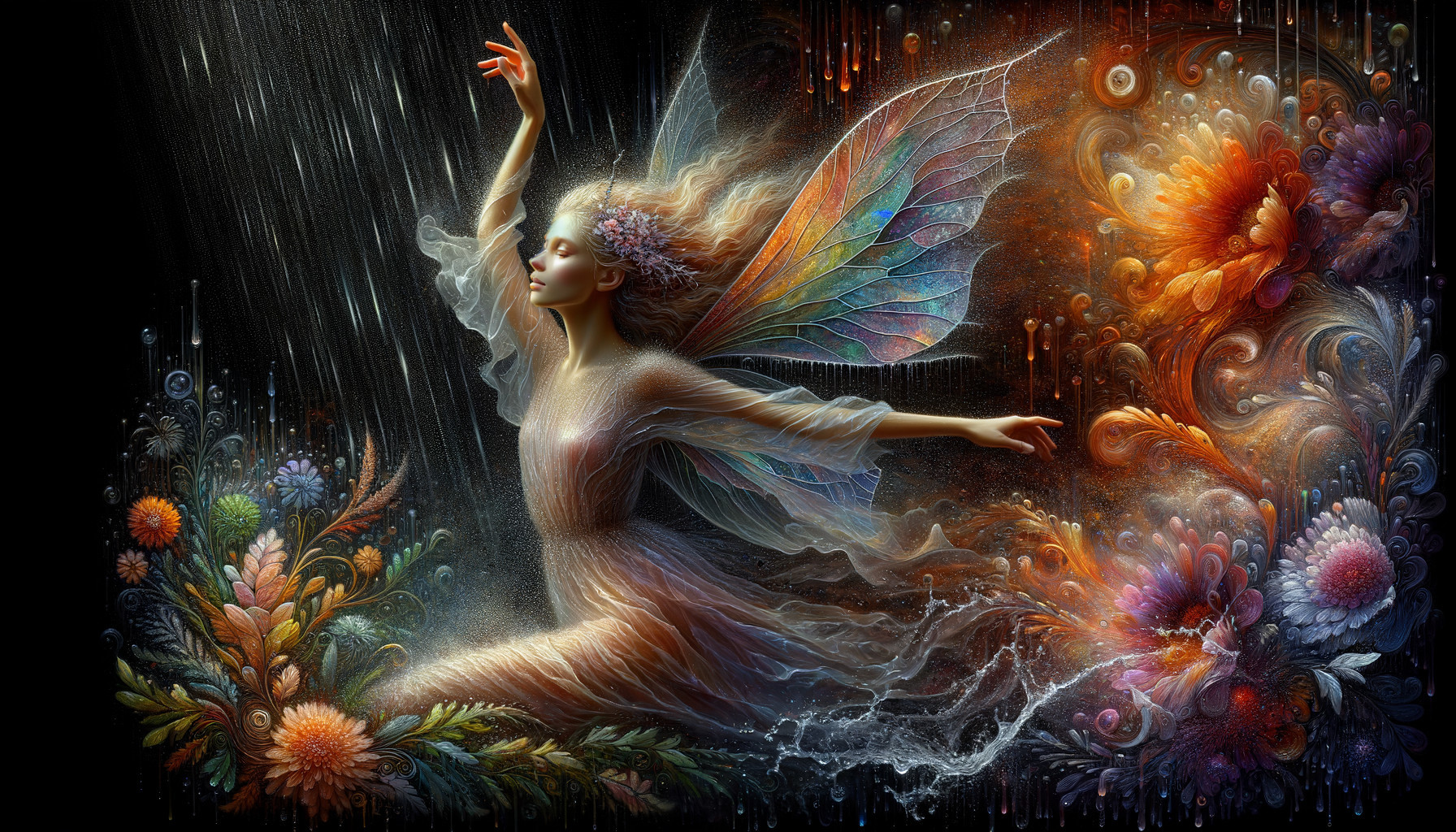 A radiant fairy with iridescent wings amidst a floral fantasy, her dress sparkling as she gracefully reaches out into the rain.