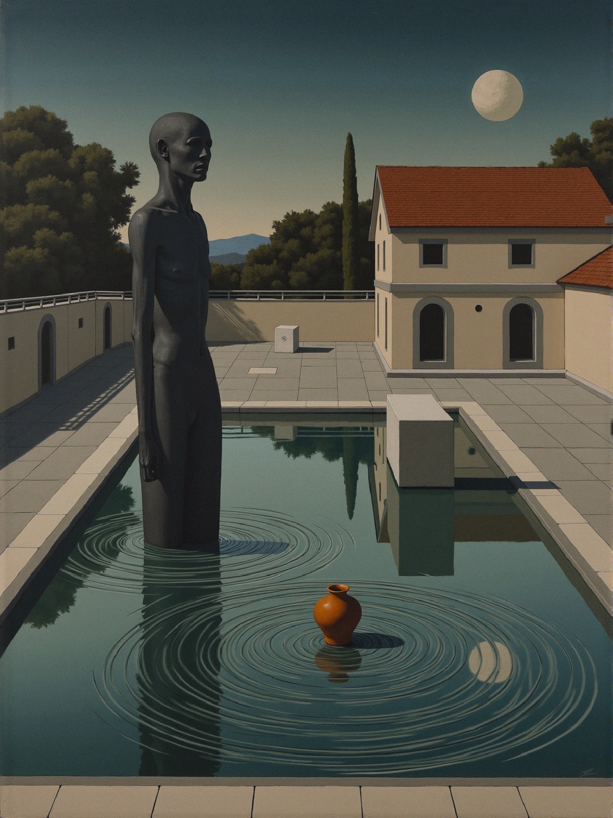 The painting features a surreal courtyard with a central pool reflecting a twilight sky and a full moon. An elongated figure stands by the water, evoking isolation, while muted colors and shadows enhance the dreamlike atmosphere.