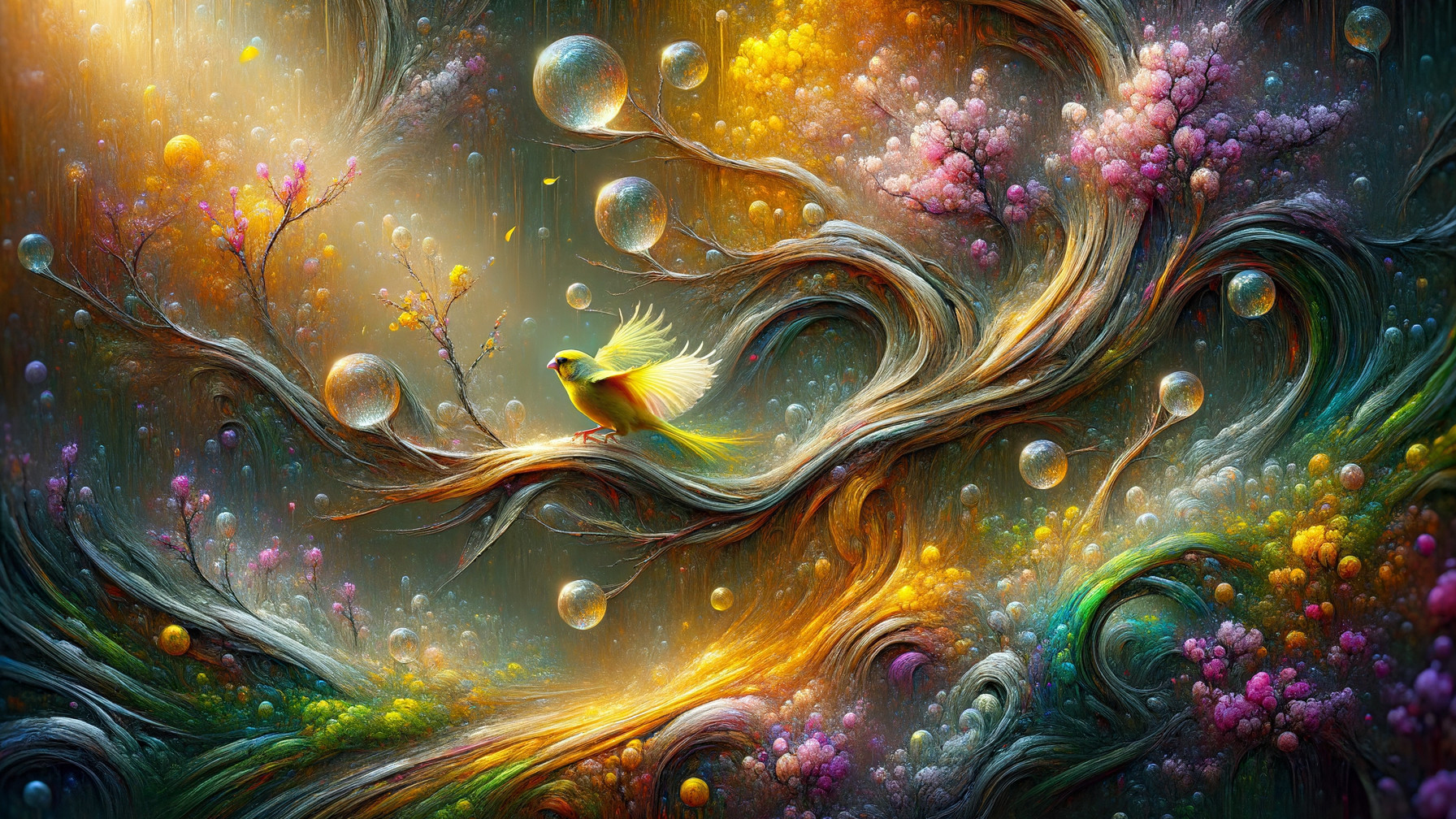 A vibrant and intricate digital artwork depicts a stylized scene with a yellow bird perched on a twisted tree branch. The background is a swirling kaleidoscope of colors, with hues of gold, orange, pink, purple, blue, and green blending seamlessly. Numerous translucent, glowing orbs resembling bubbles or dew drops are