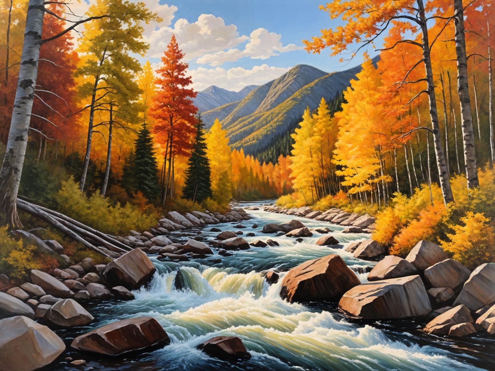 A vibrant autumn landscape featuring a rushing river surrounded by colorful trees in shades of orange and yellow, with majestic mountains in the background under a bright blue sky.