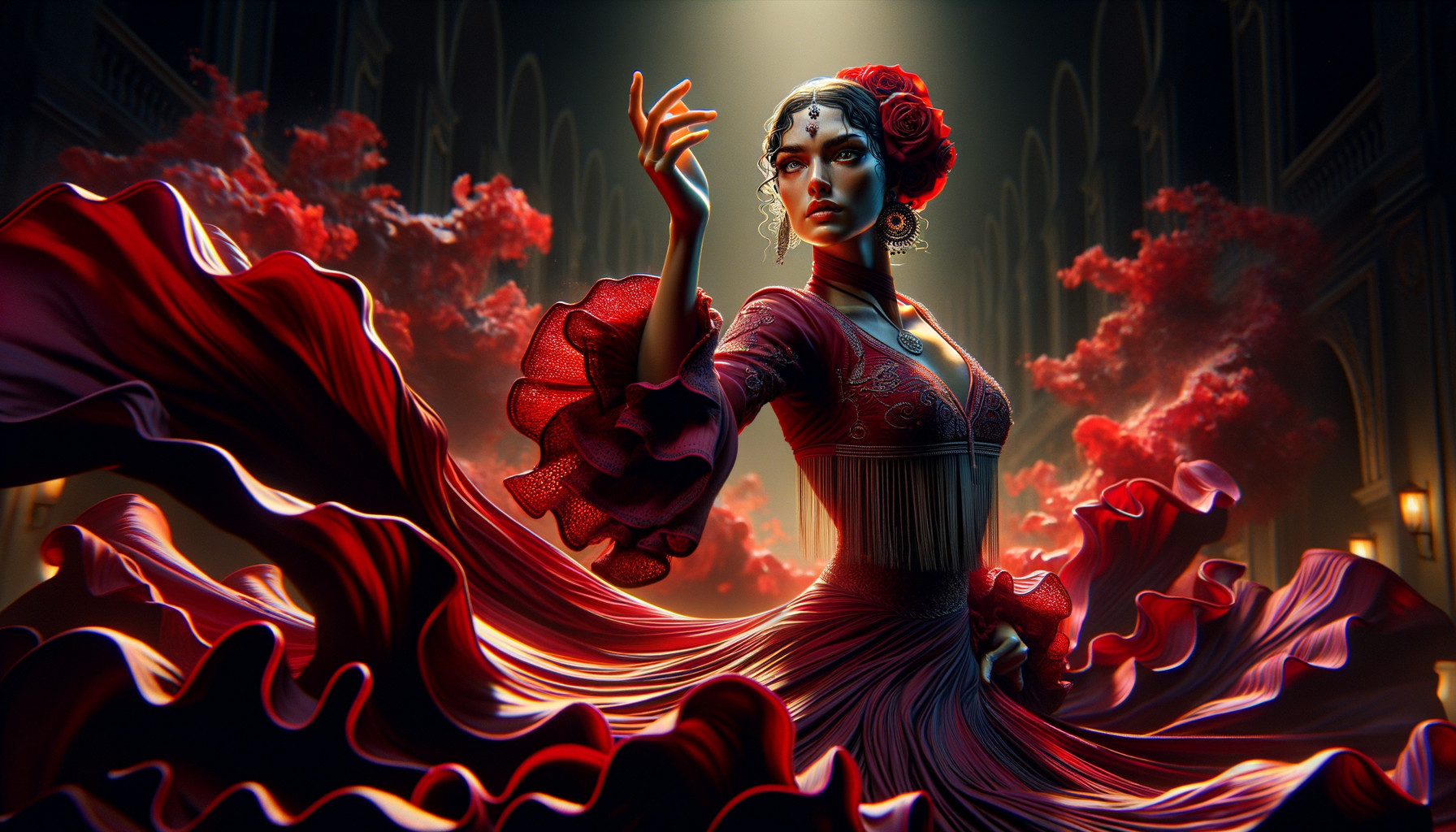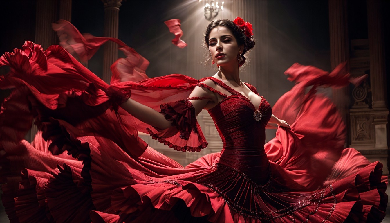 A woman in a stunning red flamenco dress dances passionately, with her skirt dramatically swirling around her in a dimly lit, elegant room.