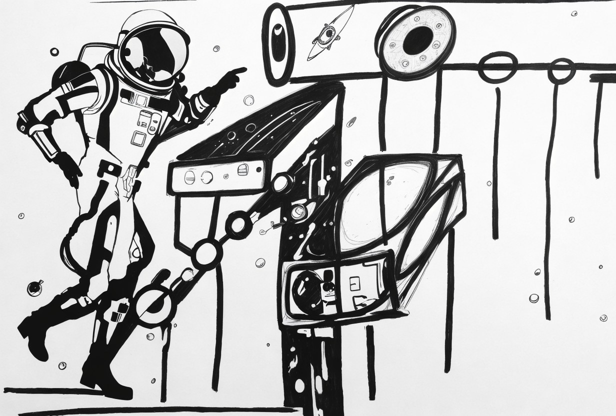 An astronaut floats in space with stylized stars, planets, a satellite, and a telescope in a black-and-white illustration.