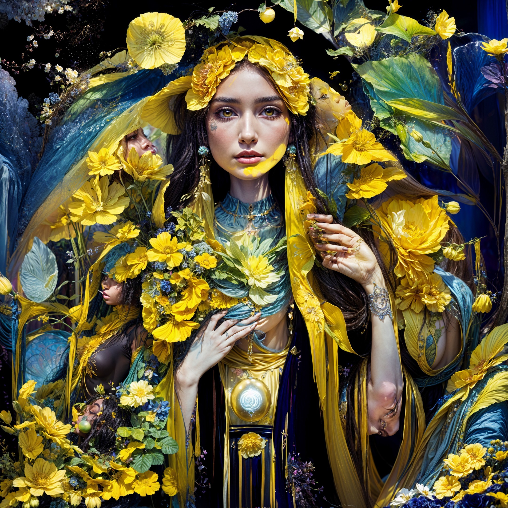 A serene woman adorned with yellow flowers and a flowing veil holds a lantern, set against a starry night with a full moon. Her elegant attire and the floral backdrop exude a sense of tranquility.