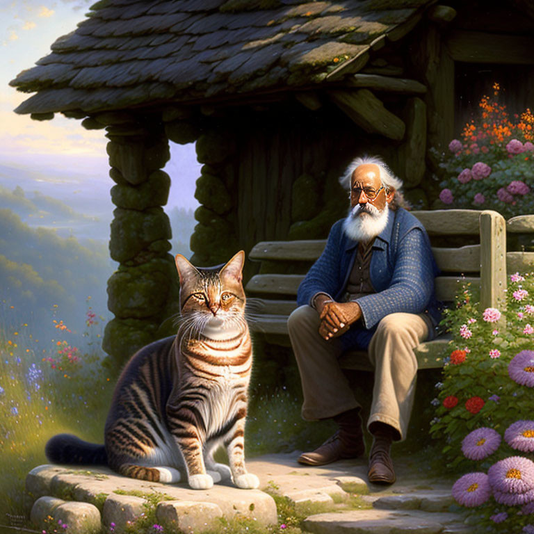 Elderly man with a cat on bench near wooden hut in lush garden