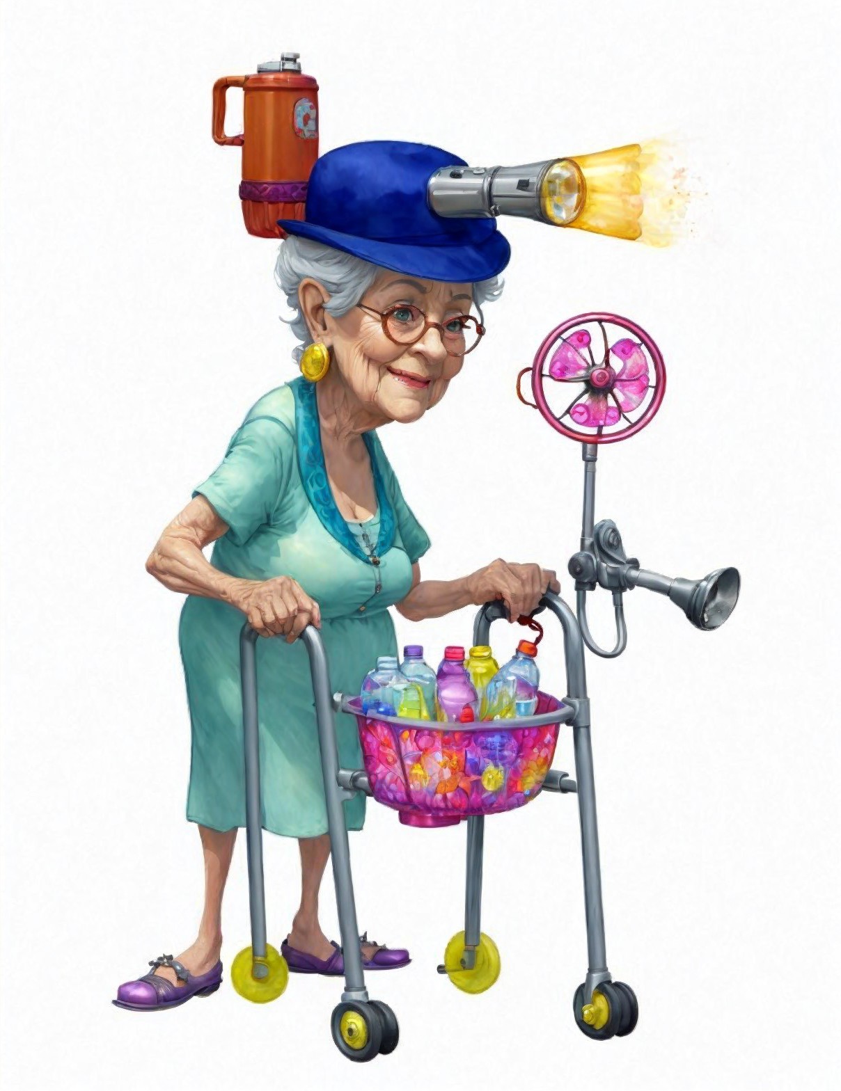 An elderly, animated woman with glasses and a walker equipped with whimsical items like a fan, horn, and thermos.