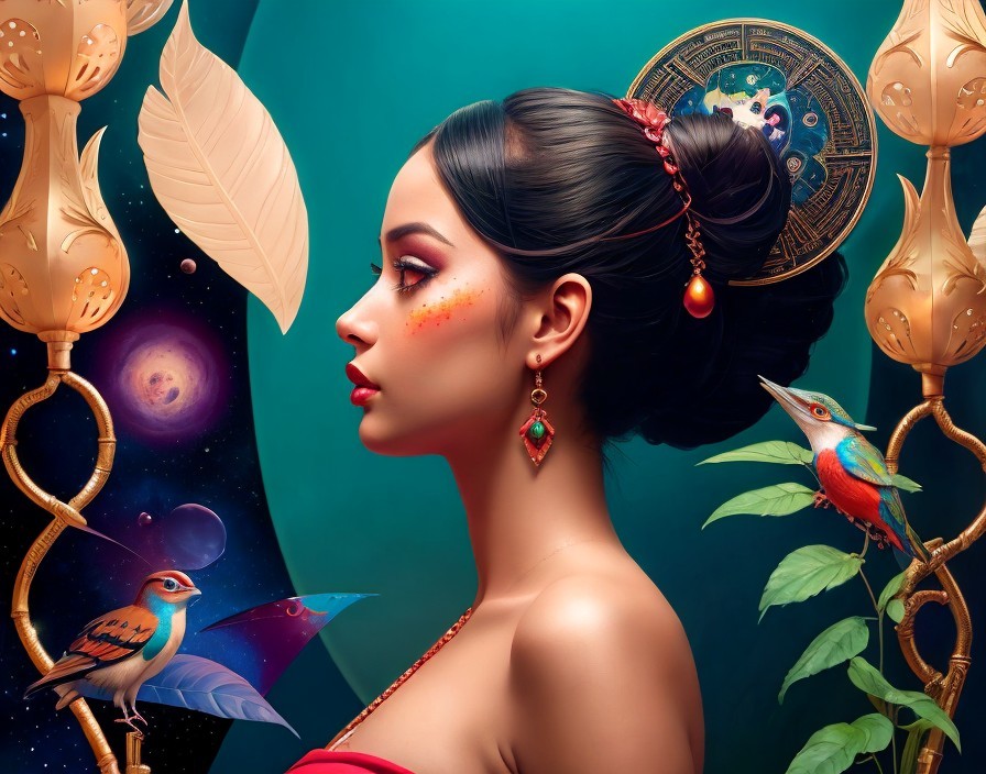 A woman with an elaborately floral hairstyle and earrings is depicted in a vibrant, fantastical setting with lush flowers and leaves.