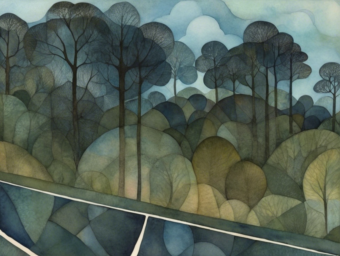 A serene landscape features tall, dark trees and rolling green hills, with a quaint village of simple houses and a distinct, charming hut. The sky is a blend of deep blues and muted greens.