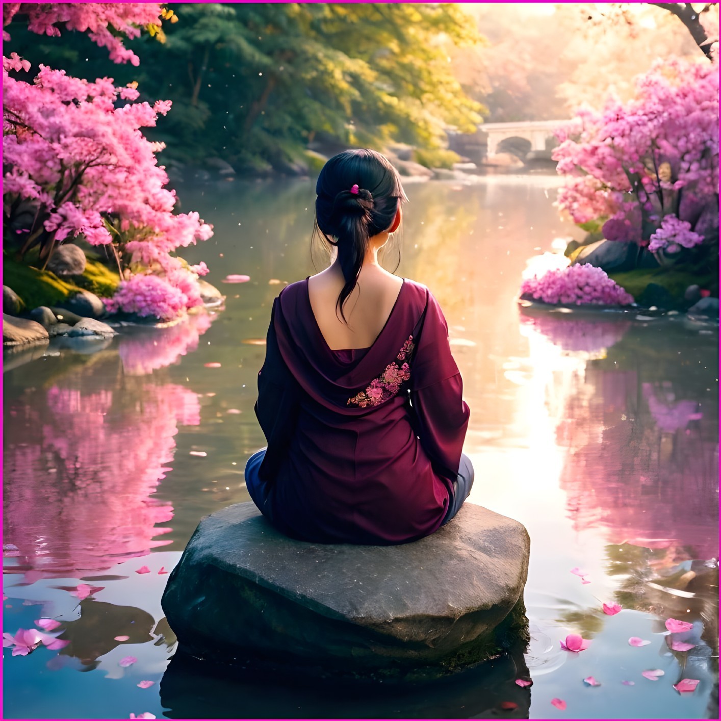An enchanting scene unfolds in a serene Buddhist monastery garden where a young Asian woman meditates on a stone bench amidst swirling cherry petals. The setting is tranquil, with sakura trees, bonsai bushes, and a picturesque wooden monastery in the background, all bathed in the gentle glow of the morning sun.