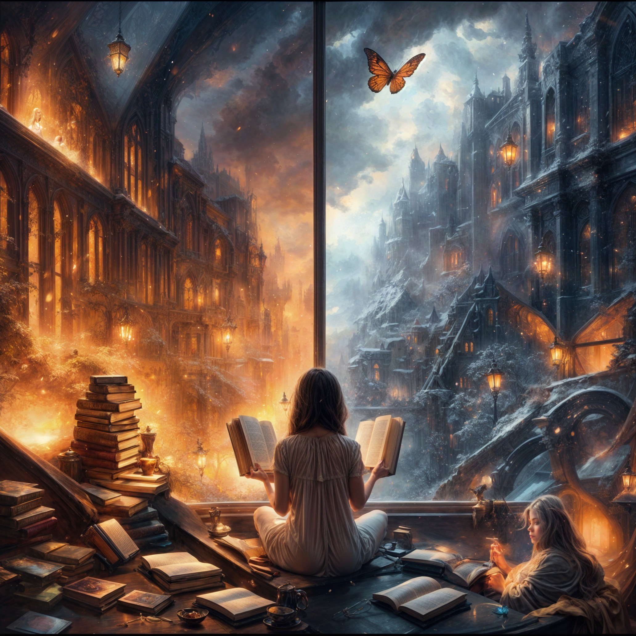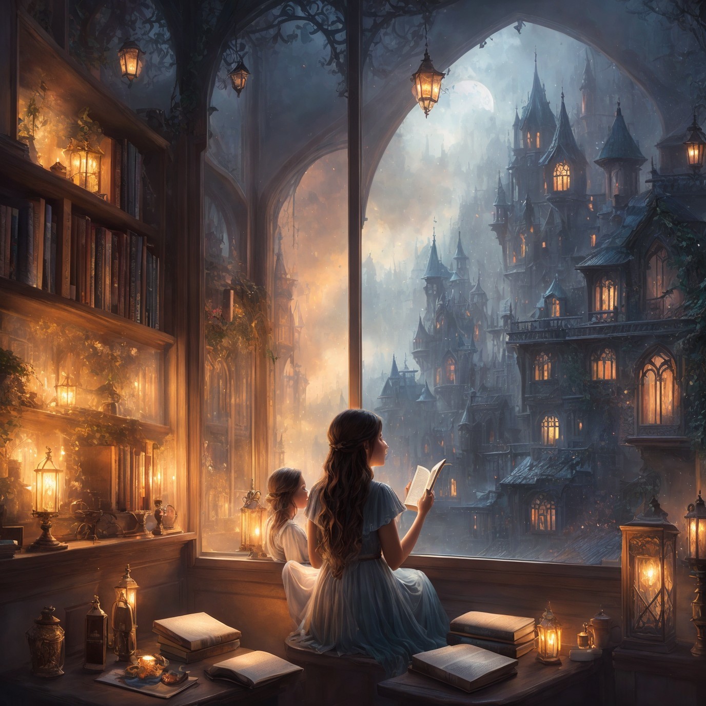 A serene scene shows a girl reading by a window, with a black cat beside her. Outside, a magical city glows in twilight, surrounded by gothic architecture and warm lantern light.