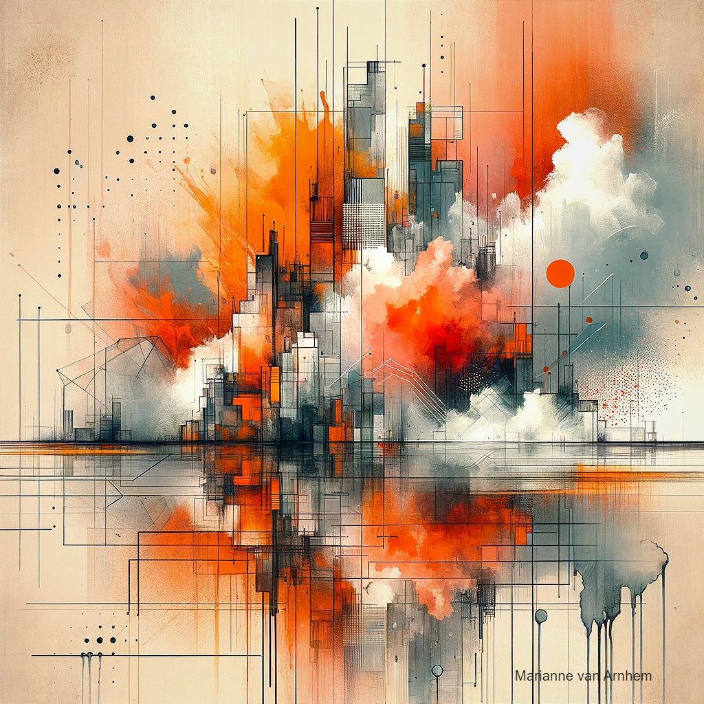 This artwork features a dynamic blend of geometric shapes and vibrant colors, particularly oranges and grays, creating a sense of movement and depth that mirrors abstract urban landscapes.