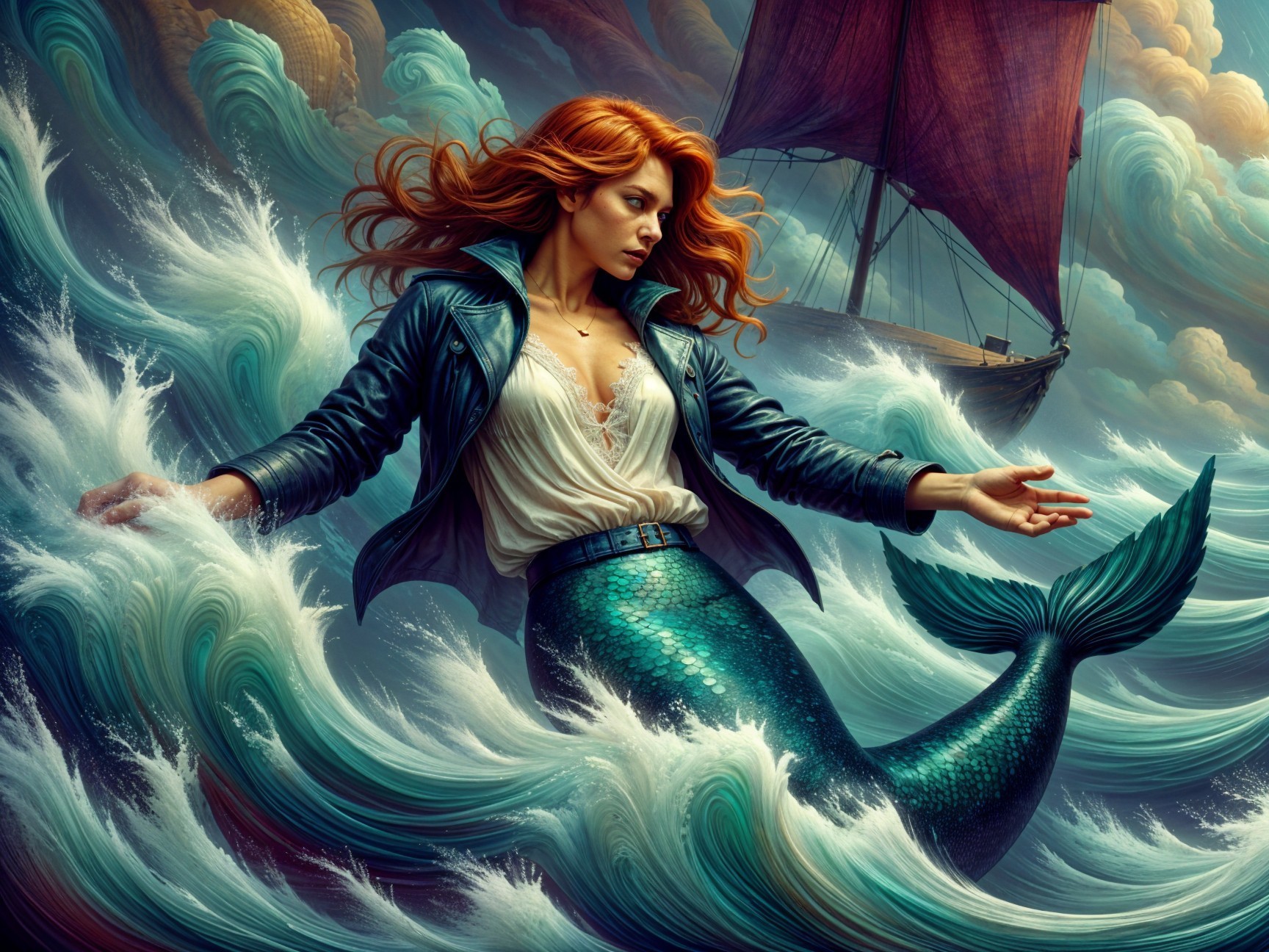 A mermaid with flowing hair wearing a nautical-inspired outfit lounges on crashing waves, striking a fierce pose near an old ship sailing through a stormy sea.