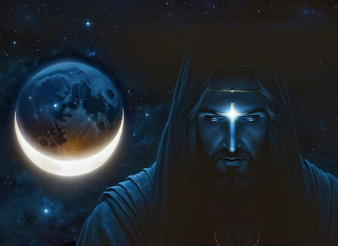 Cody's Eye on a picture of the Moon and Cross, (not my Picture) The "lesser light" is the moon, which governs the night. While it reflects the sun's light, it serves as a guide in the darkness, symbolizing hope and guidance.