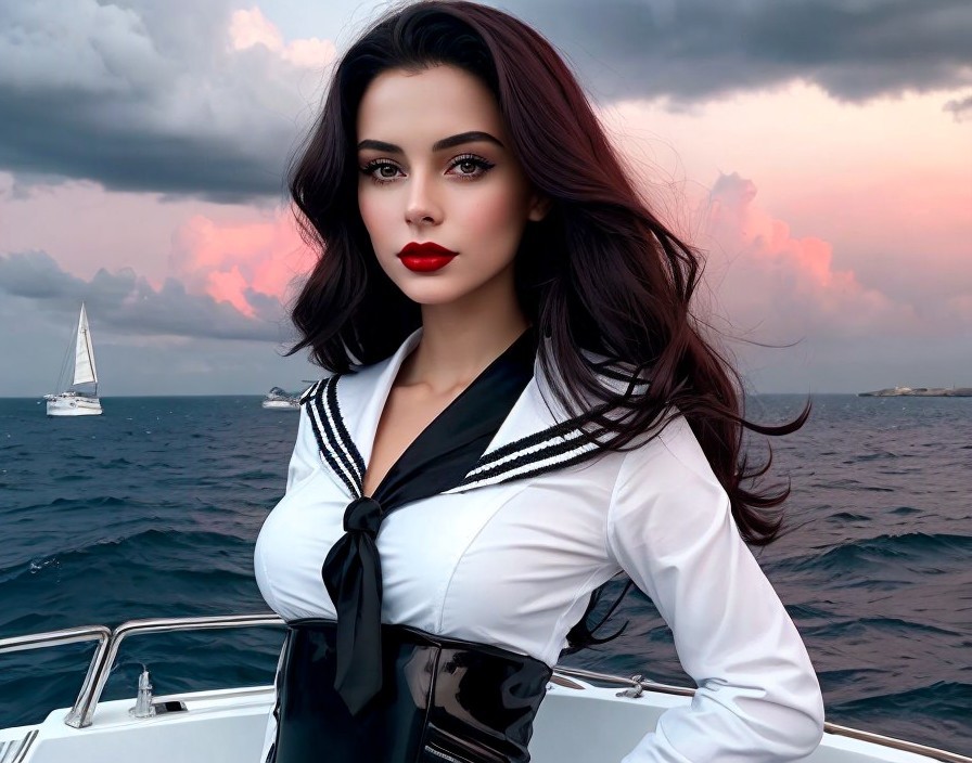 A woman with dark hair and red lipstick, wearing a sailor outfit, stands on a boat with the ocean and ships in the background, dramatic sky.
