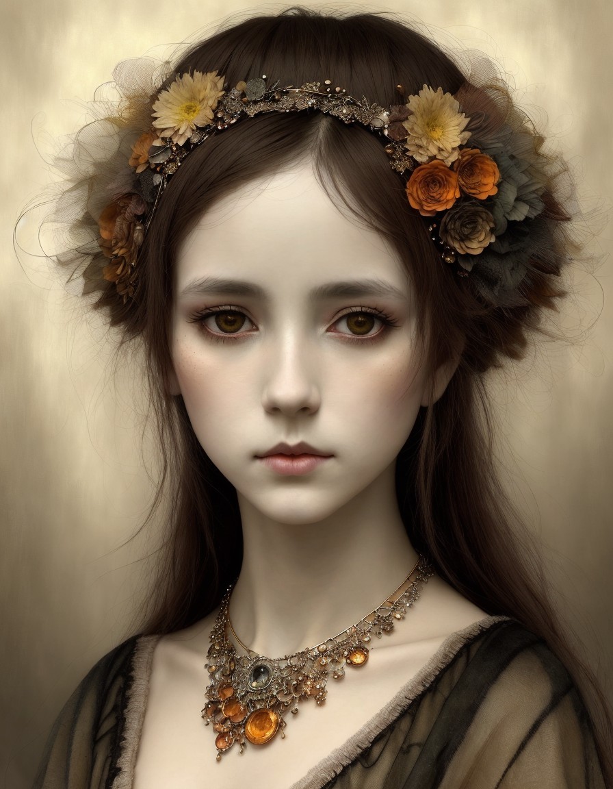 A portrait of a young woman with big green eyes, adorned with an autumnal floral crown and vintage jewelry, against a beige background.