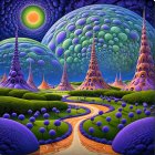 A surreal alien landscape features towering, purple spires under a vibrant cosmos. Twisting pathways and lush, colorful vegetation create an otherworldly atmosphere, illuminated by a glowing sun.