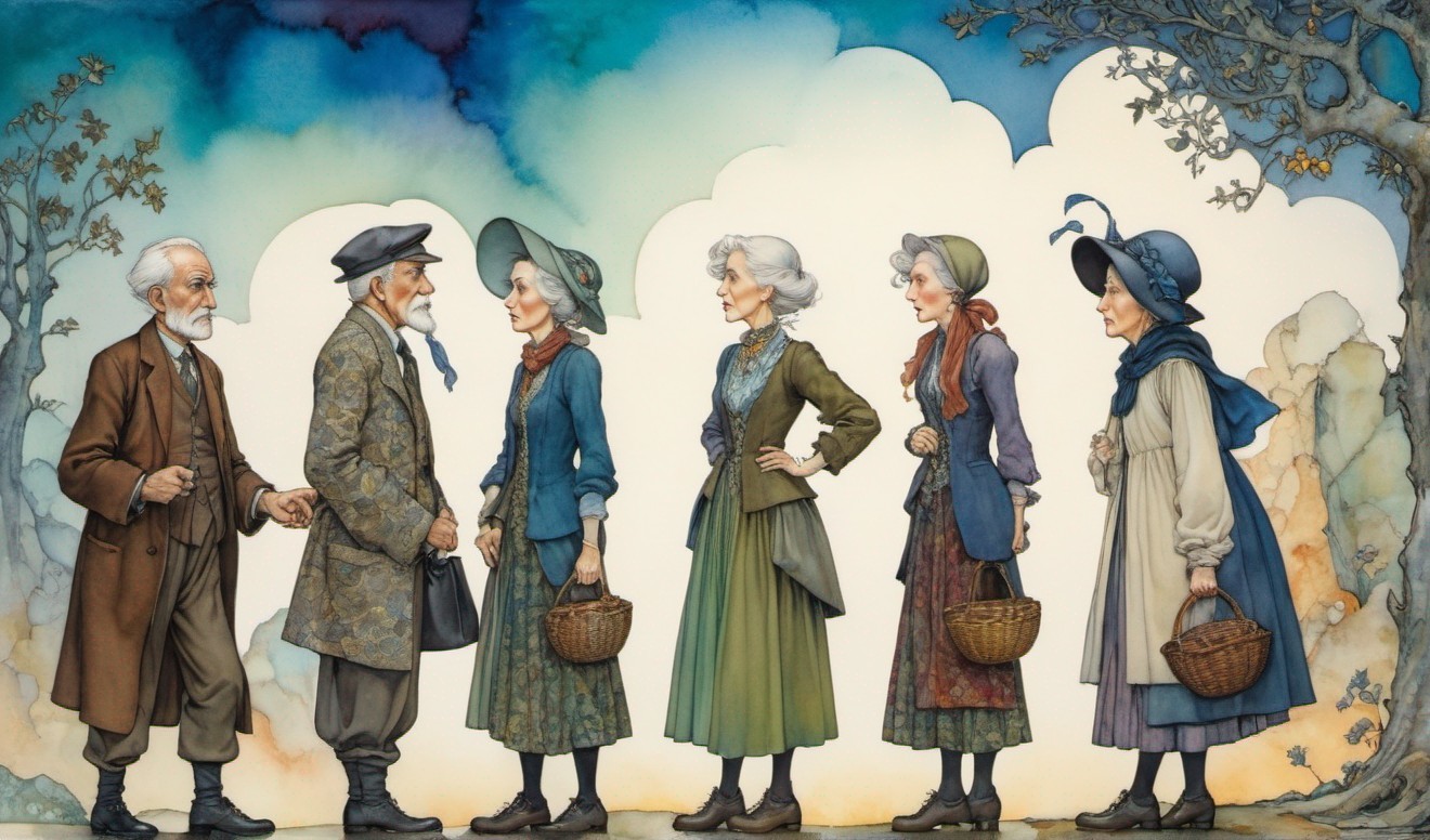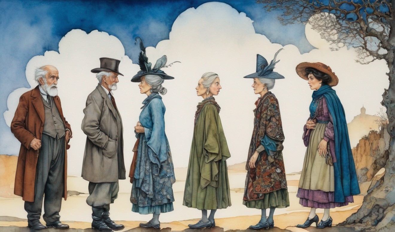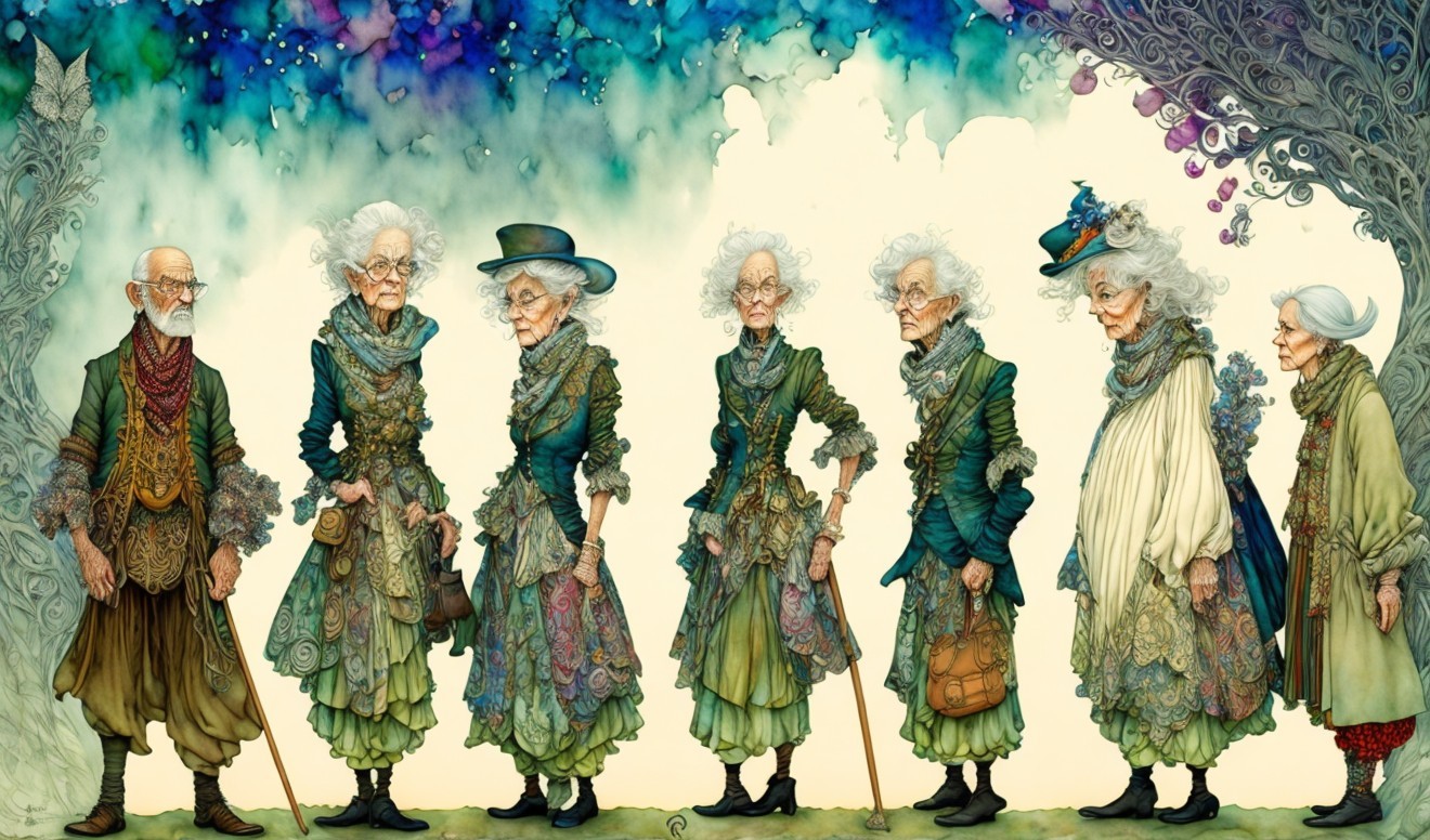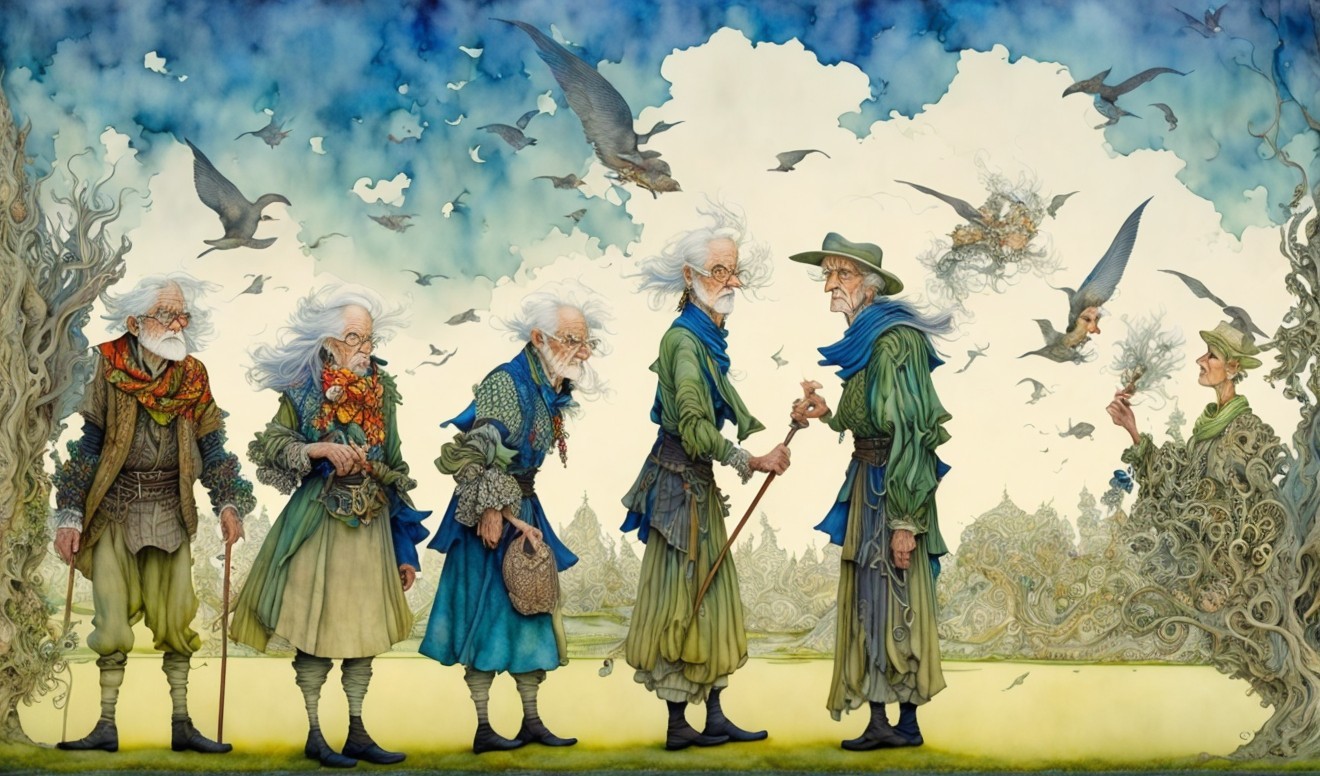 Three fantasy characters in a barren landscape, wearing elaborate medieval costumes with a magical aura.