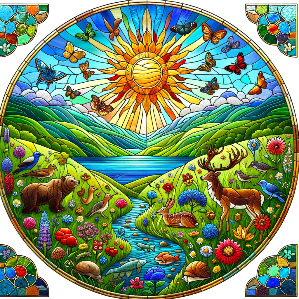 A colorful stained glass window design featuring a vibrant nature scene with animals, a river, and a radiant sun.
