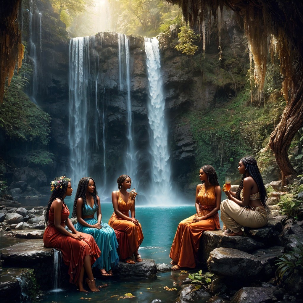 Prompt: "beautiful women of color sitting around drinking near a extremely long cascading waterfall from deep underground, 3D, the image, inspired by music and"