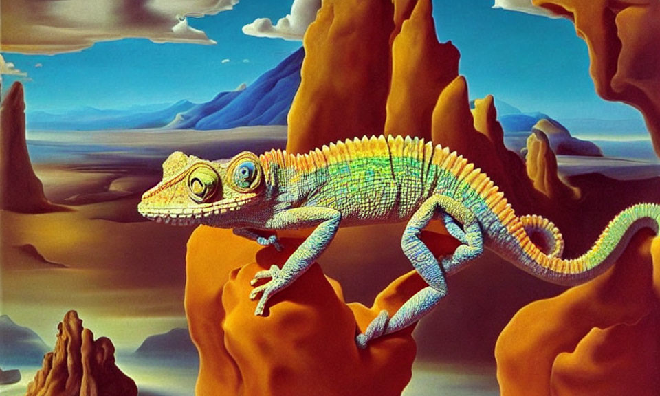 Colorful Chameleon on Surreal Desert Landscape with Sandstone Formations