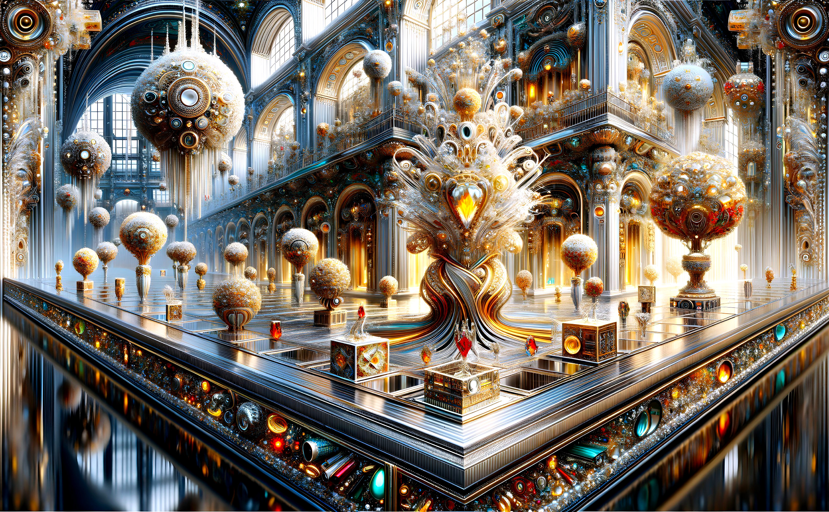 A surreal, ornate interior with intricate mechanical structures and globes, featuring metallic and jewel-like details within a grand, luminous hall.