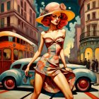A stylish woman in a colorful floral dress and oversized hat poses confidently amidst vintage cars and vibrant buildings, capturing a lively urban scene filled with retro charm.