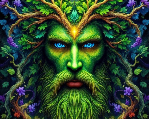 A vibrant landscape features stylized trees with colorful foliage, set against a dark sky with stars. Two elegant deer stand in a golden valley, framed by glowing blues and reds.