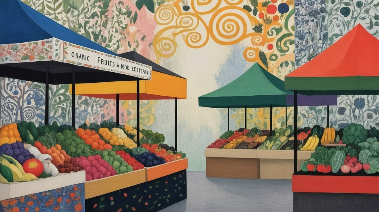 Vibrant Farmers Market with Colorful Stalls and Canopies