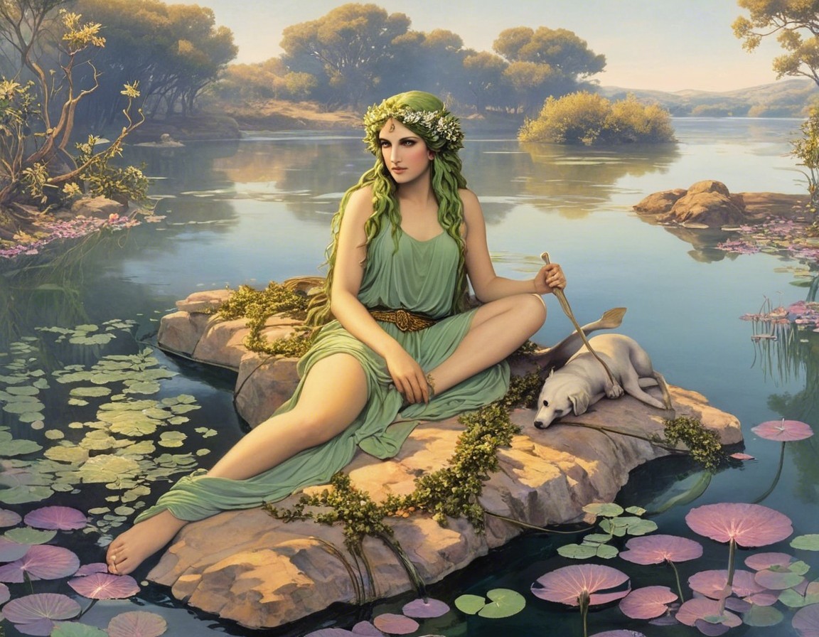A mystical figure sits gracefully on a rocky shore, adorned with a leafy crown and a flowing green dress. Surrounded by calm waters and serene nature, she embodies tranquility and beauty.
