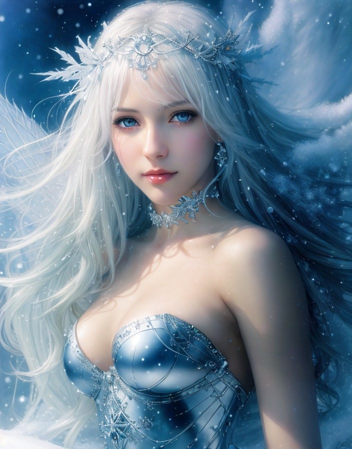 Prompt: A special snow fairy, surrounded by a whirlpool of glistening, sparkling snowflakes, a charming, graceful platinum blonde with blue eyes.