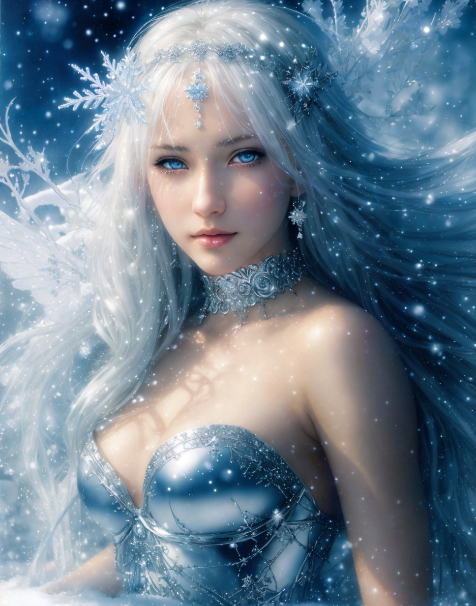 A special snow fairy, surrounded by a whirlpool of glistening, sparkling snowflakes, a charming, graceful platinum blonde with blue eyes.