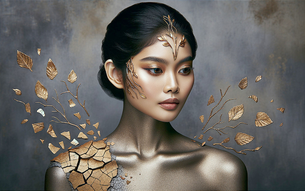 A woman with artistic metallic gold leaf makeup and 3D leaves swirling around her, set against a mottled grey backdrop.