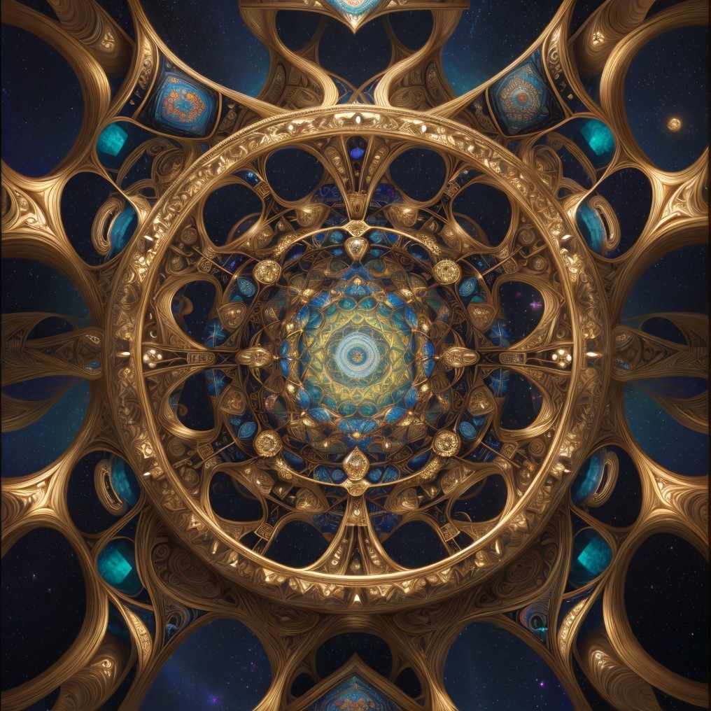 A digital artwork of a woman with striking blue eyes, surrounded by intricate geometric patterns in a dynamic, tunnel-like formation.