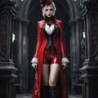 A striking portrayal of a woman with pale skin, long blonde hair, piercing red eyes, and a bold red lipstick, looking directly at the viewer with a stern expression. She is adorned in a red beret, a red long-sleeved jacket, a white blouse, a red corset, and