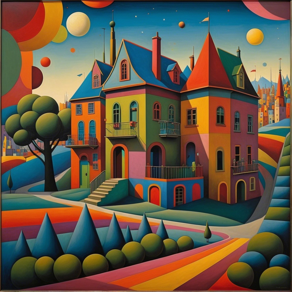 A vibrant, surreal landscape featuring two colorful houses with flags, rolling hills, and whimsical trees. Bold shapes and vivid colors create a playful, dreamlike atmosphere.