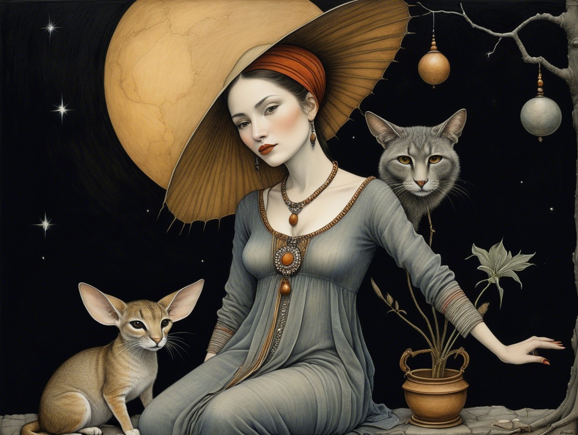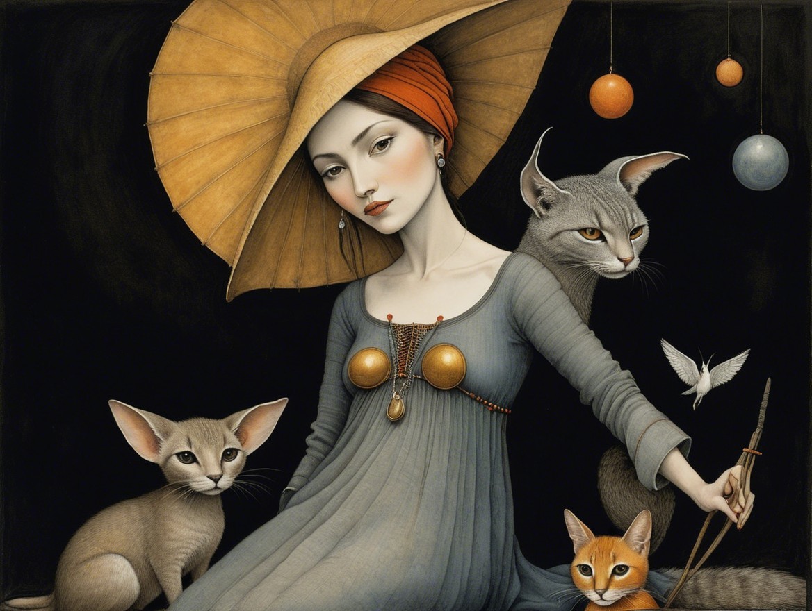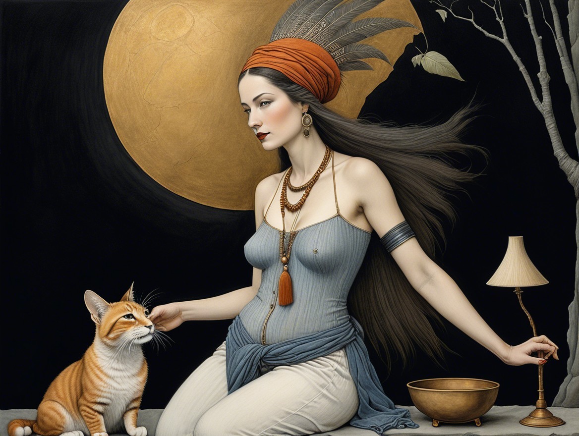 A serene woman in a blue dress sits beside a cat, her hair elegantly styled. The background features geometric shapes and warm tones, creating a harmonious and artistic atmosphere.