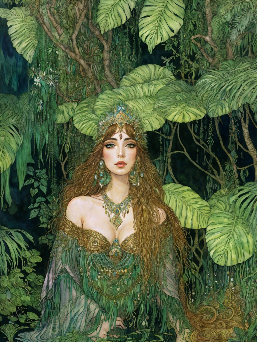 An illustration of a woman with elaborate headgear stands in a lush jungle, exuding an aura of regal mystique.