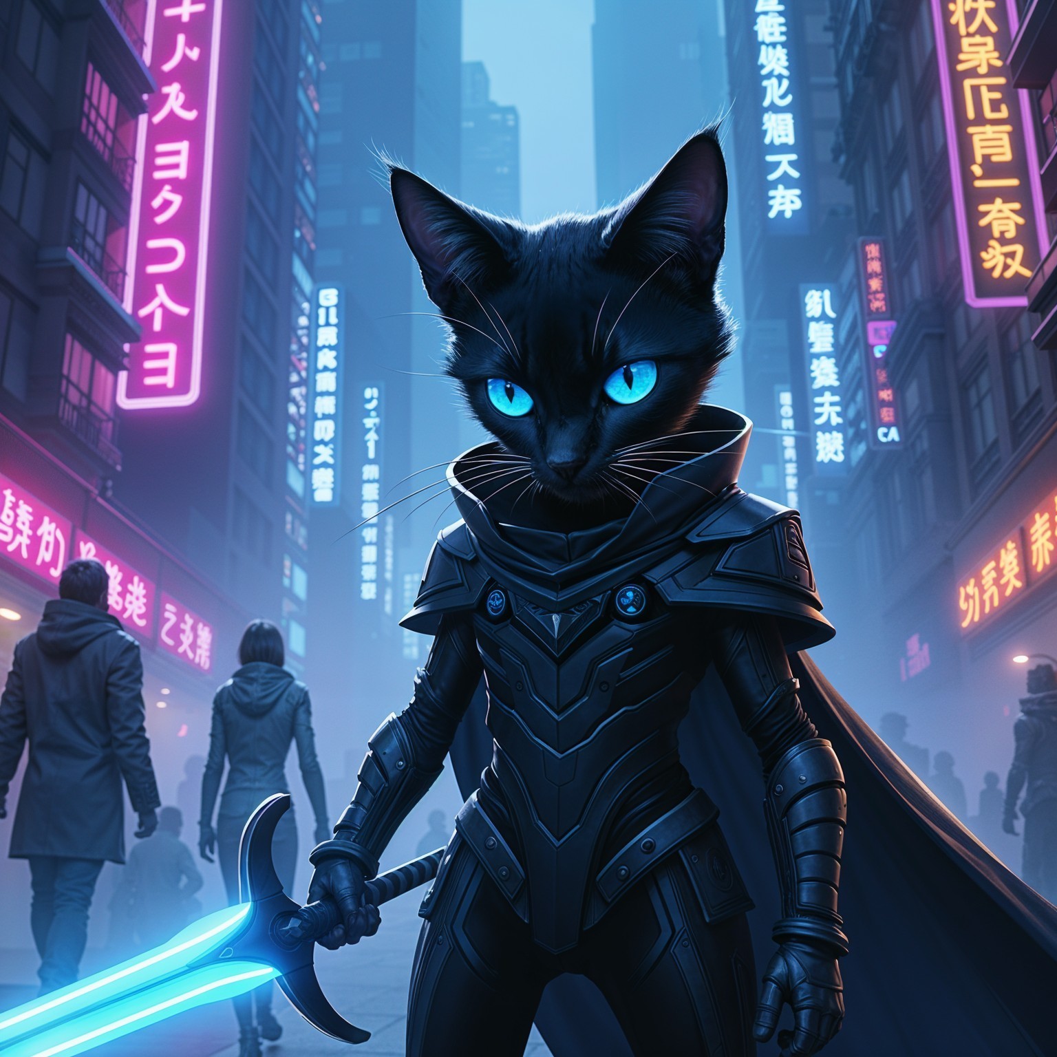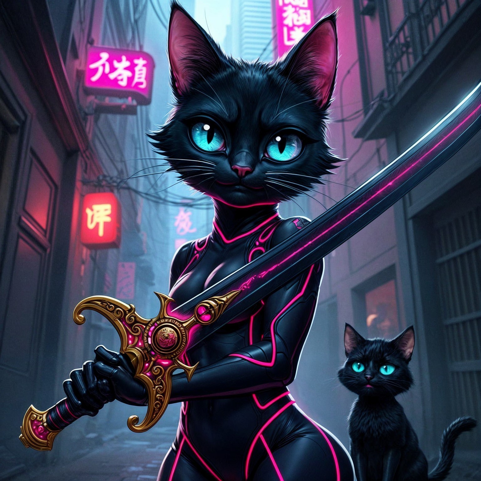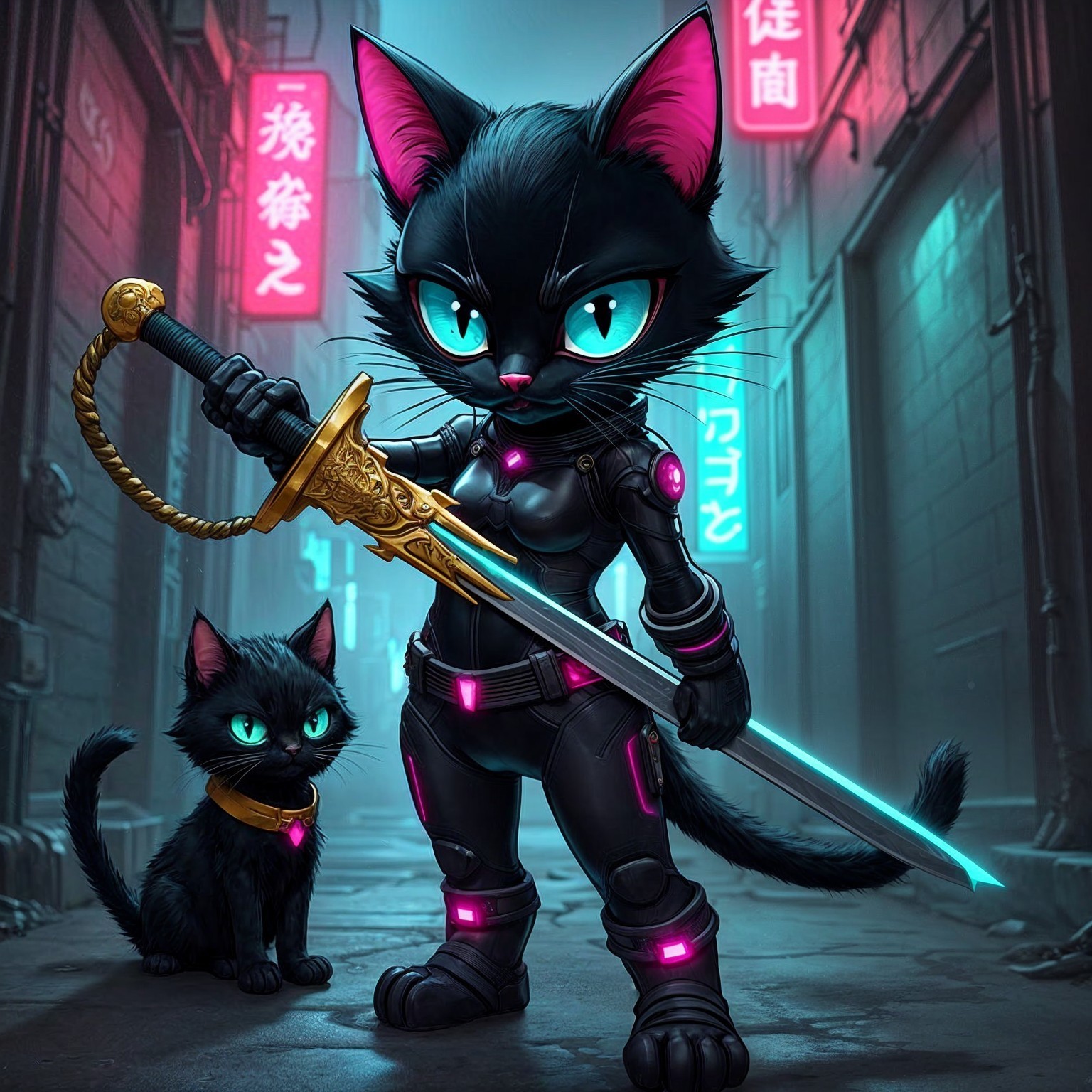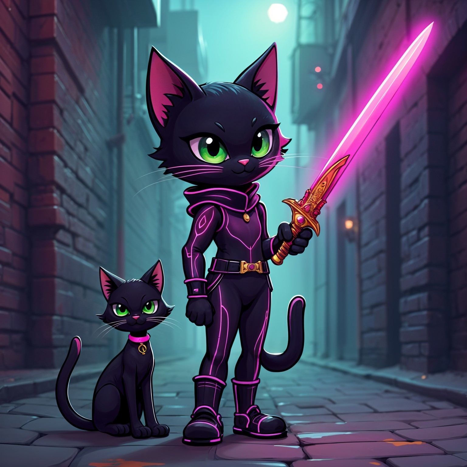 A stylish black cat in a sleek superhero outfit holds a glowing purple sword, standing confidently in a narrow alley. A smaller, curious black kitten watches by its side, adding to the adventurous vibe.