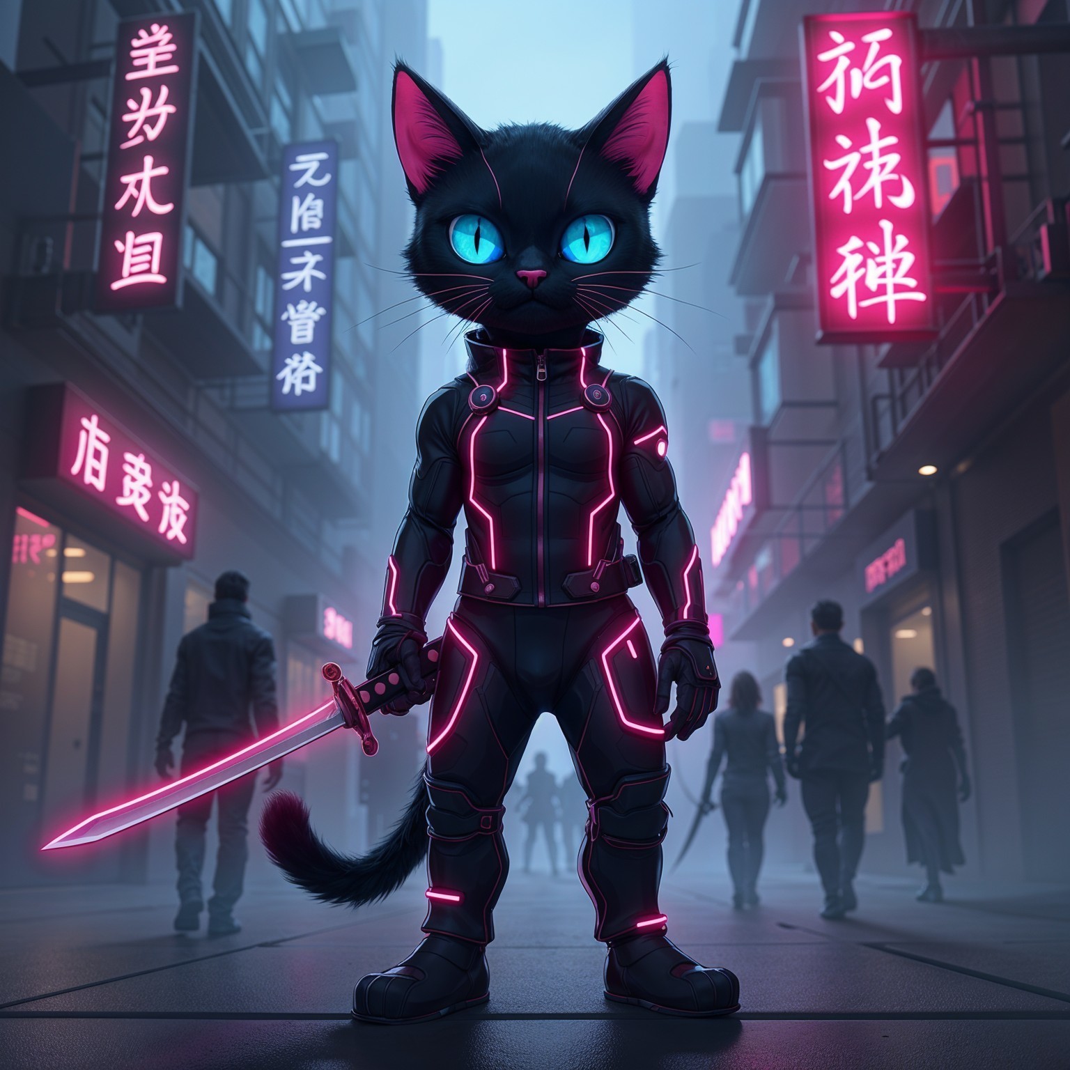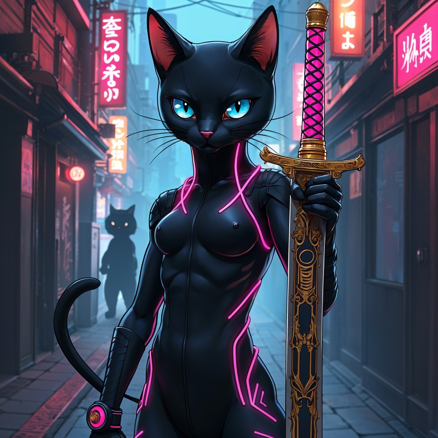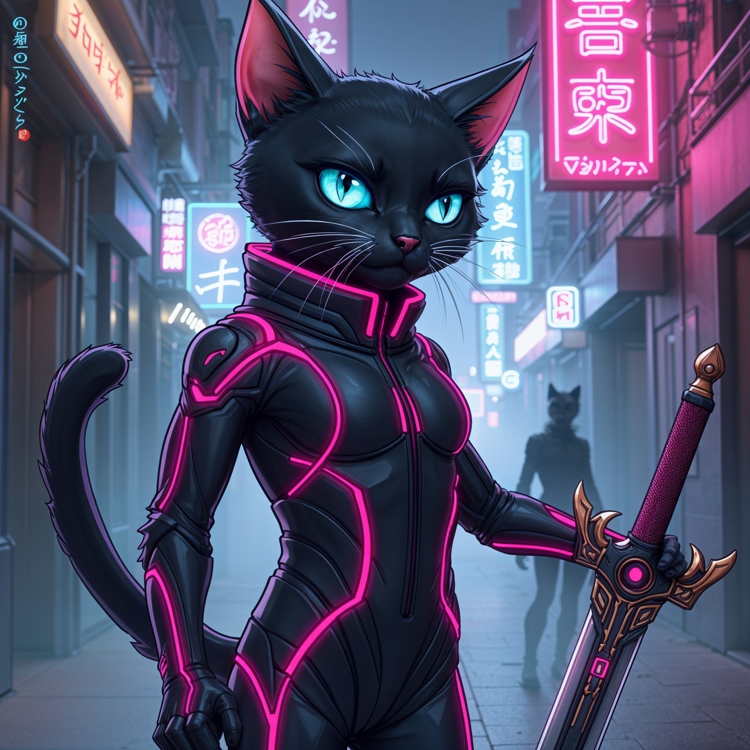 A stylish black cat in a sleek superhero outfit holds a glowing purple sword, standing confidently in a narrow alley. A smaller, curious black kitten watches by its side, adding to the adventurous vibe.