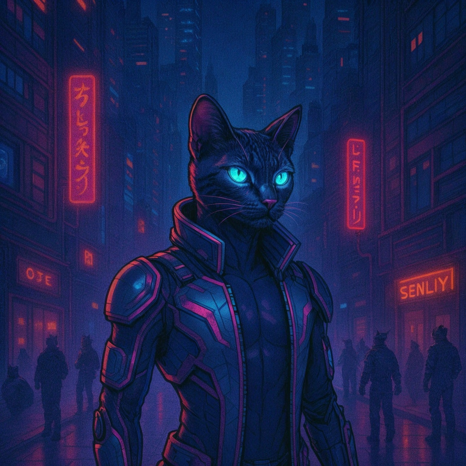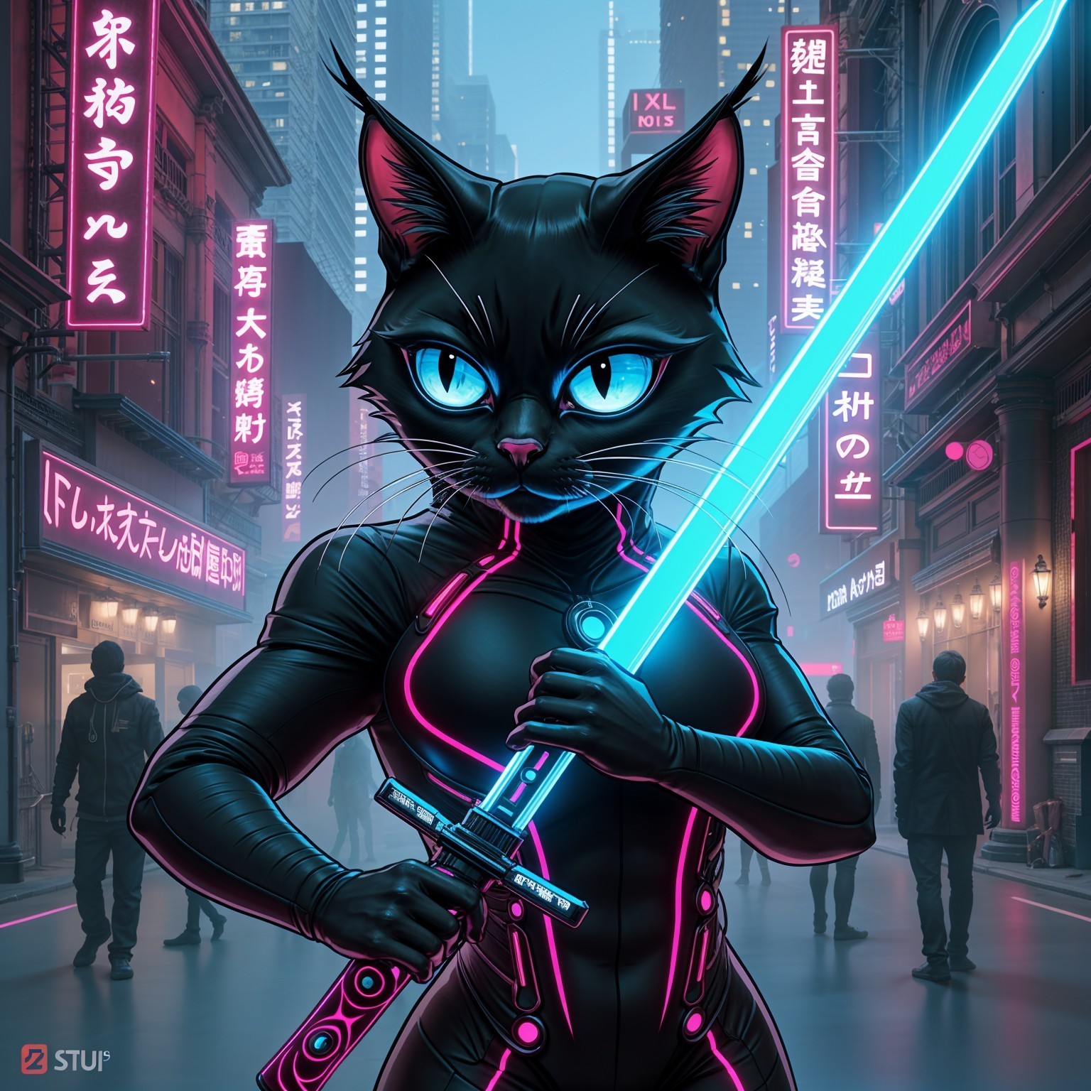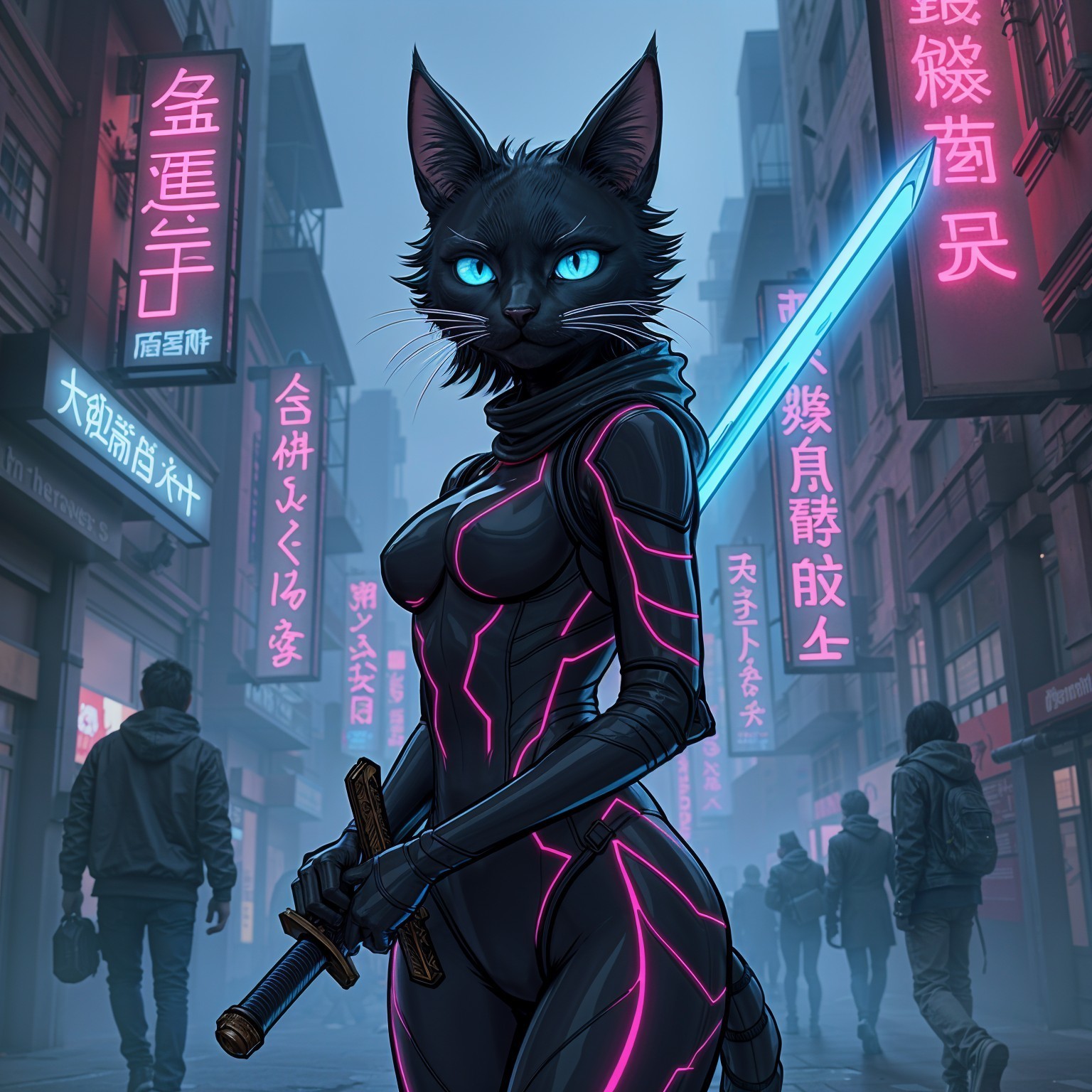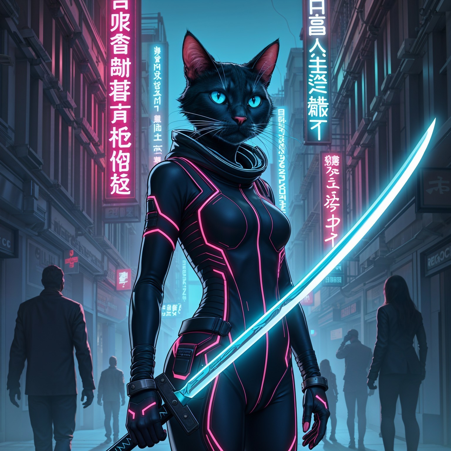 A stylish black cat in a sleek superhero outfit holds a glowing purple sword, standing confidently in a narrow alley. A smaller, curious black kitten watches by its side, adding to the adventurous vibe.