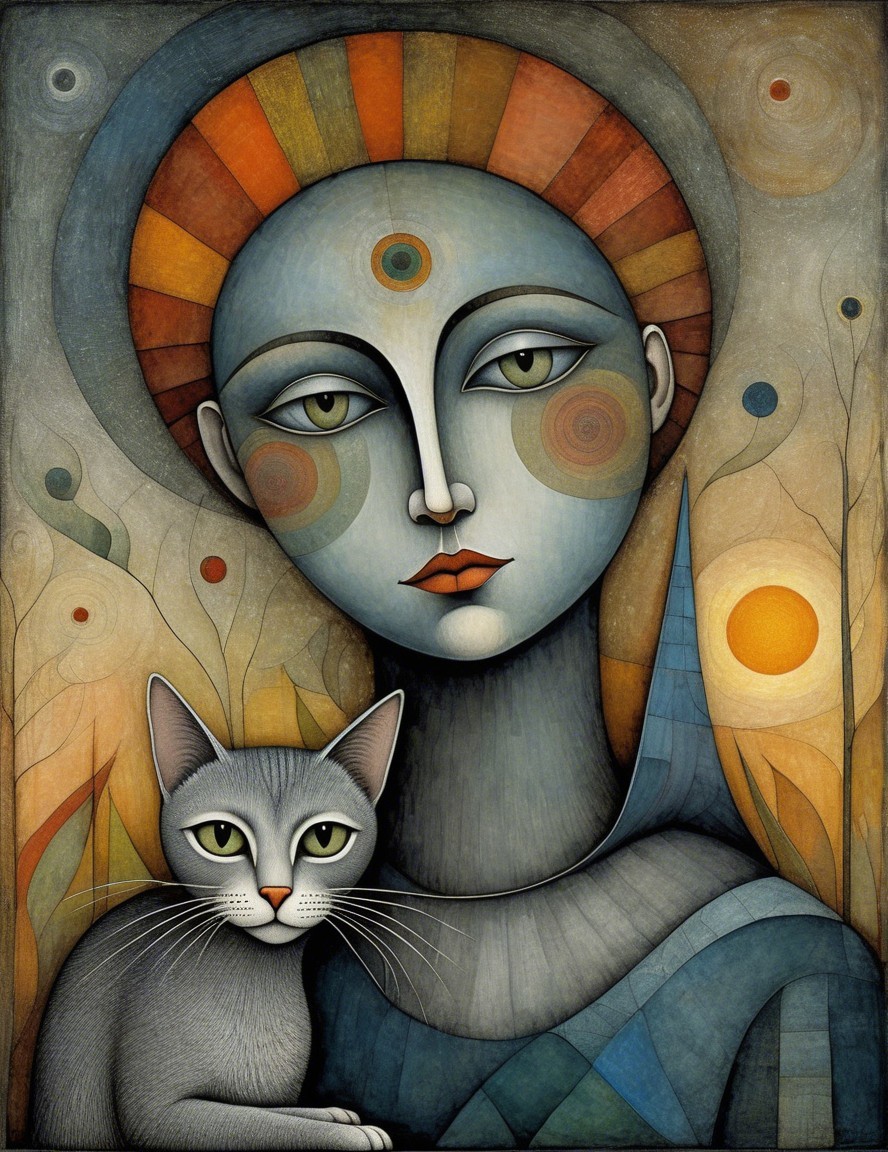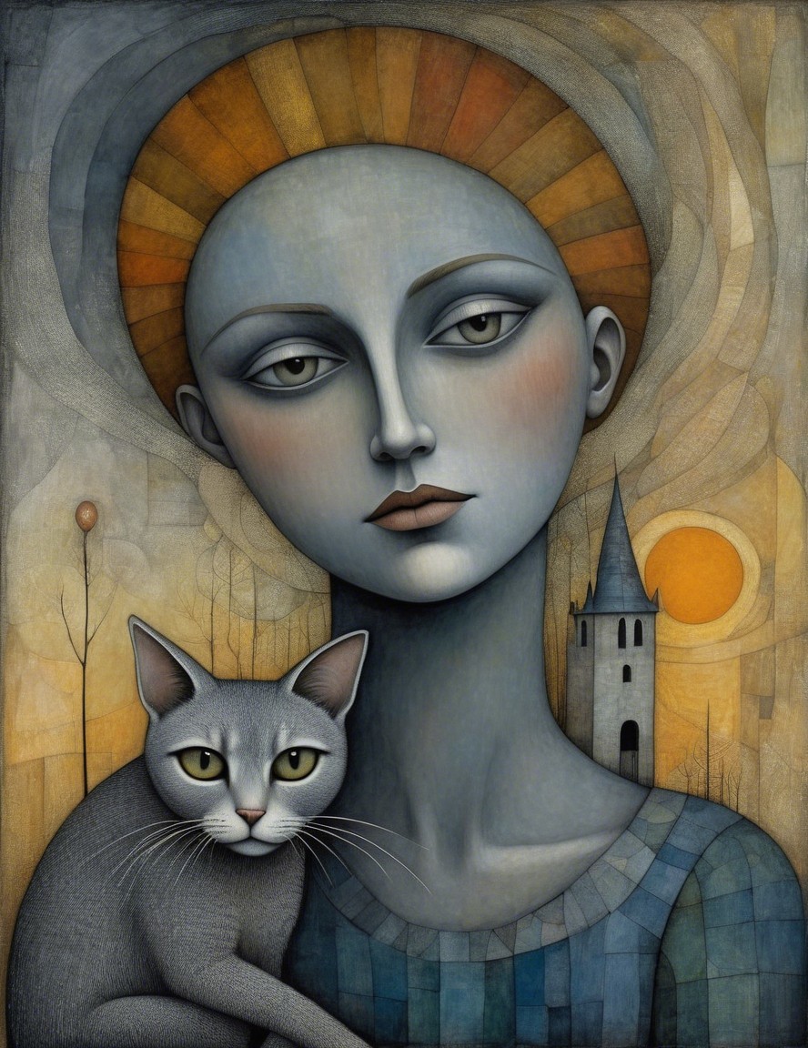 Beautiful psychedelic Creature in the style of Edward Gorey, Maurice Sendak Art Brut, moody, somber, desaturated colors, in the style of Paul Klee, Arthur Rackham enhance cat.