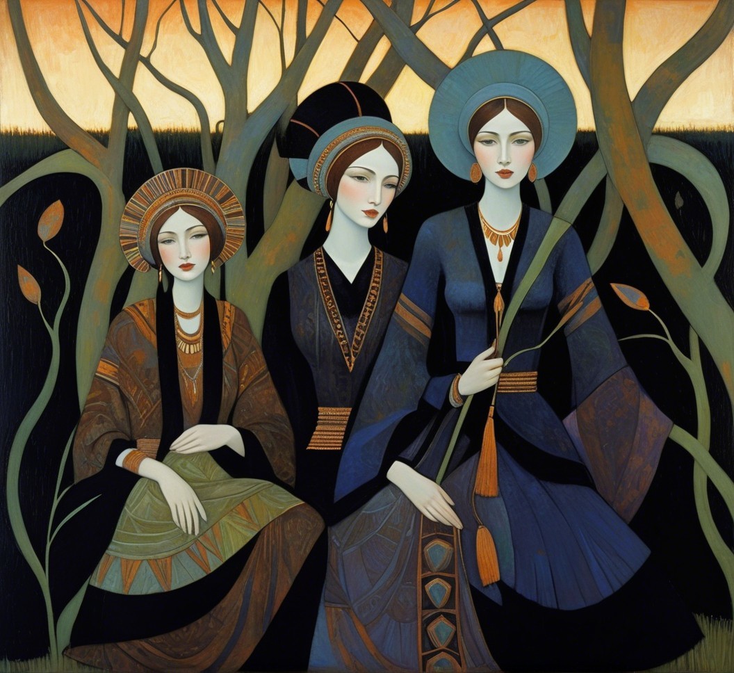 Three elegantly dressed women sit together, adorned in colorful traditional attire. Their serene expressions and distinct styles highlight a blend of culture and beauty against a warm, natural backdrop.