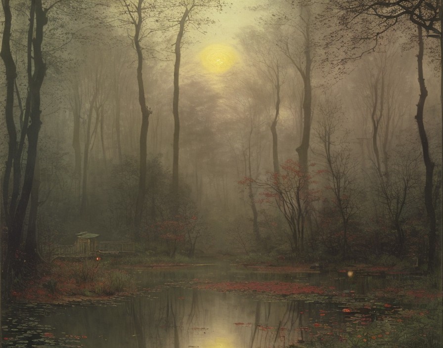 Prompt: Old overgrown pond in the autumn forest, early morning, sunrise, autumn, wet brush effect, intricate, by John Atkinson Grimshaw, by Gerald Brom, by Ivan Bilibin