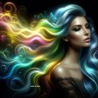 A close-up of a woman with vibrant, rainbow-colored hair flowing elegantly. Her striking makeup accentuates her features, with bright eyeliner and a glossy finish, set against a dark background.