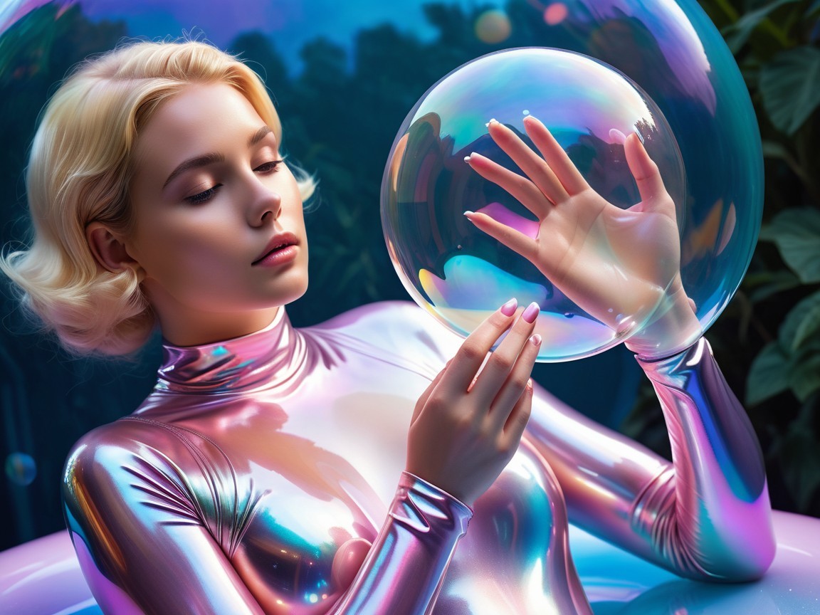 Prompt: "Giant iridescent soap bubble, refracting light, encapsulating an 18-year-old blonde woman, skin-tight rubber suit resembling a glaze, sleek and shiny texture, friendly expression, hands gently resting on the bubble's surface, ethereal atmosphere, dreamlike setting, surreal concept, detailed and realistic illustration, vibrant colors, pastel hues, soft and diffused lighting, whimsical and enchanting, Art Nouveau style, Art Deco influences, intricate patterns, digital art."