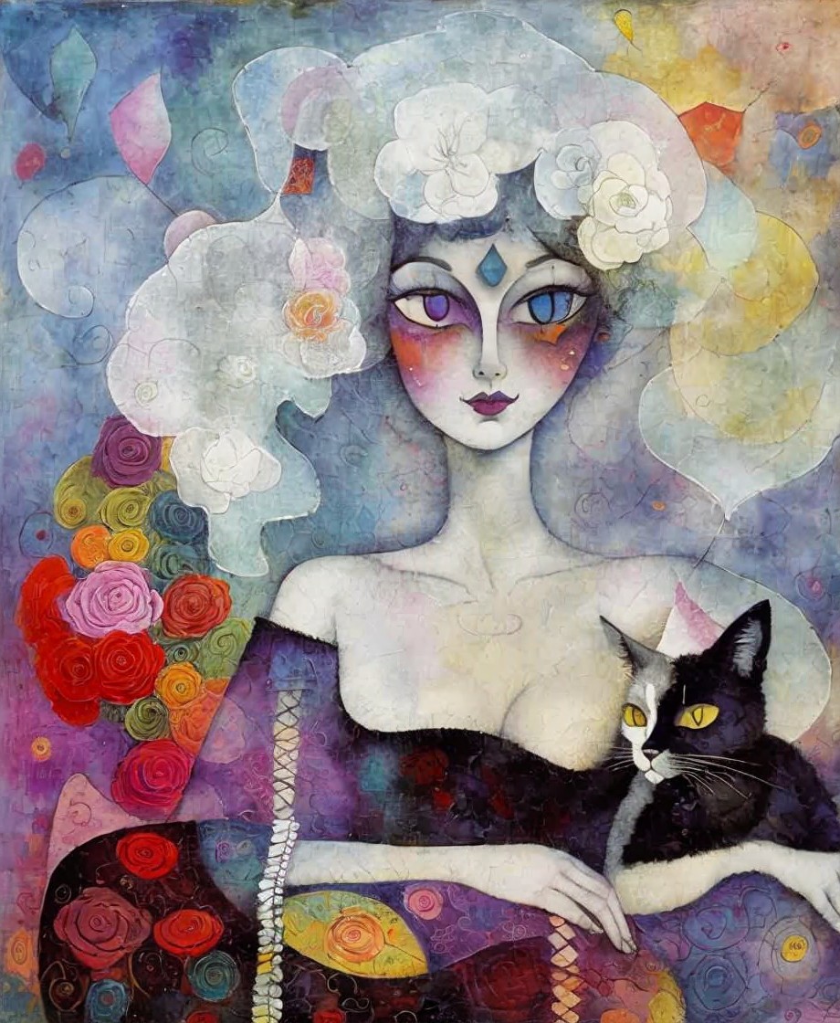 A whimsical painting of a woman with floral hair alongside a cat-headed figure and a black and white cat against a colorful backdrop.
