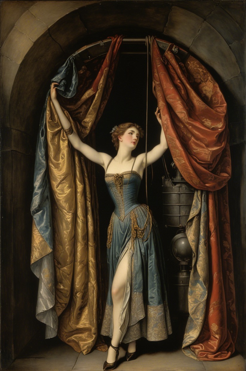 A woman in a blue gown stands by an elaborate machine, one hand holding a cloth and the other adjusting the device. The scene blends elegance with industrial elements in a dramatic setting.