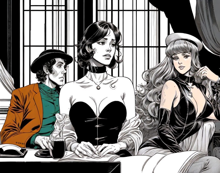 in the style of milo manara, horacio altuna, jean-pierre gibrat, herge, vittorio giardino, moebius, adam hughes, p craig russel