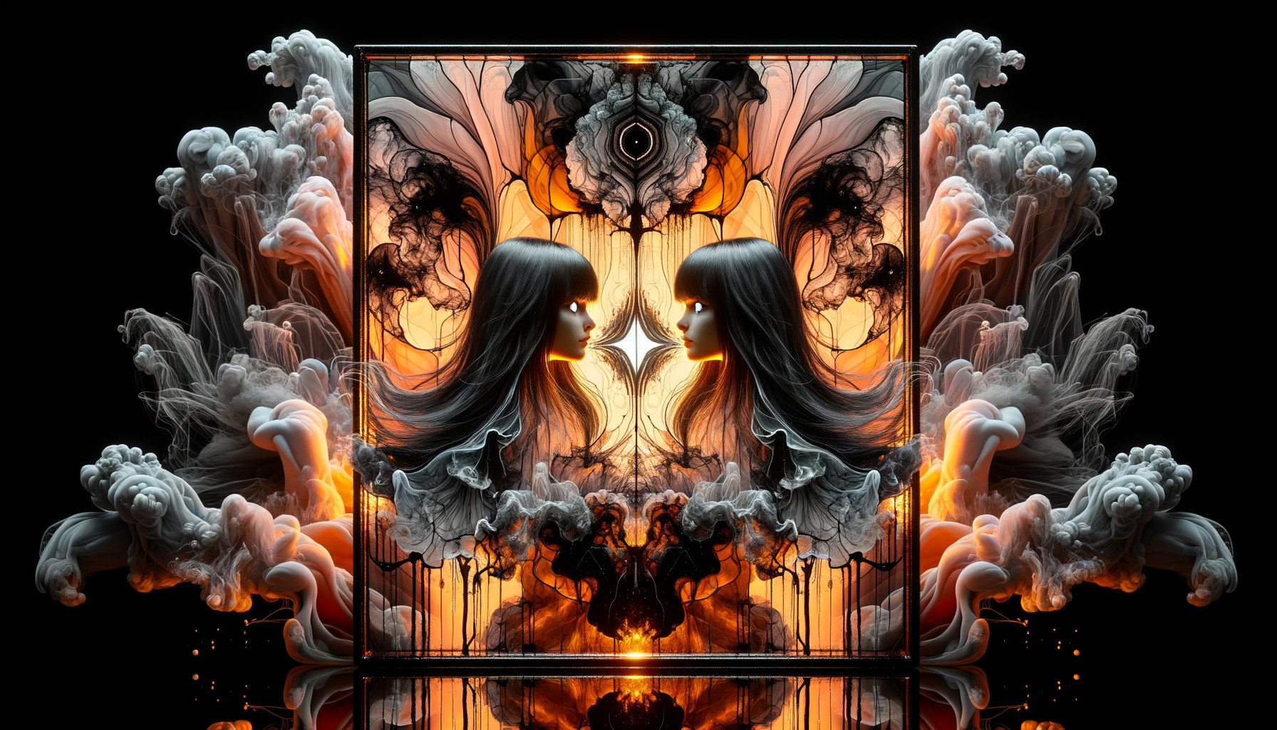 An intricate digital artwork featuring a symmetrical design with two silhouetted profiles facing each other, set against fiery orange tones and swirling patterns.